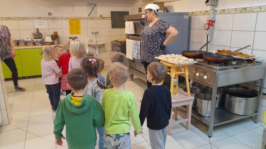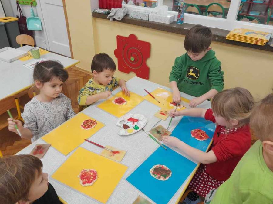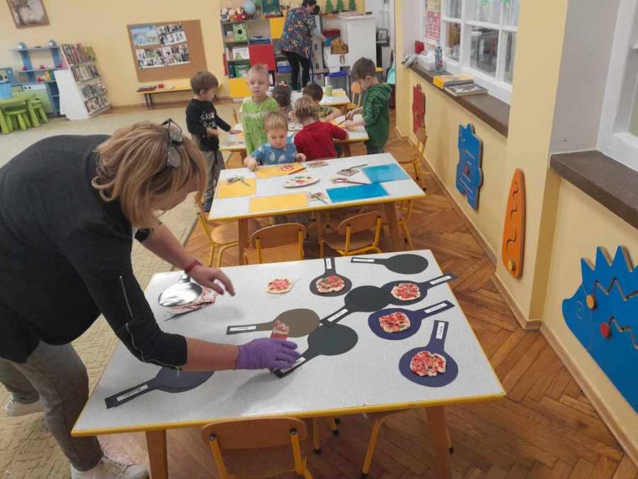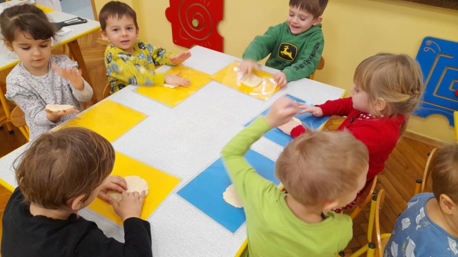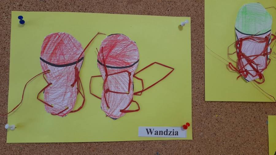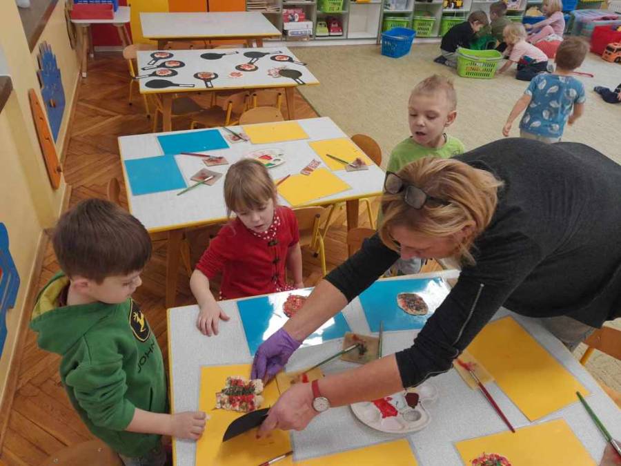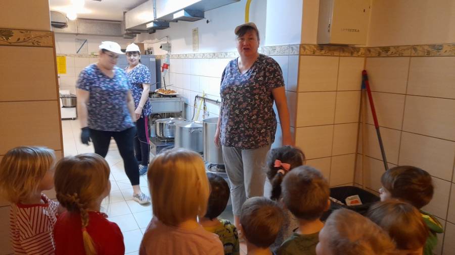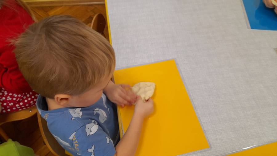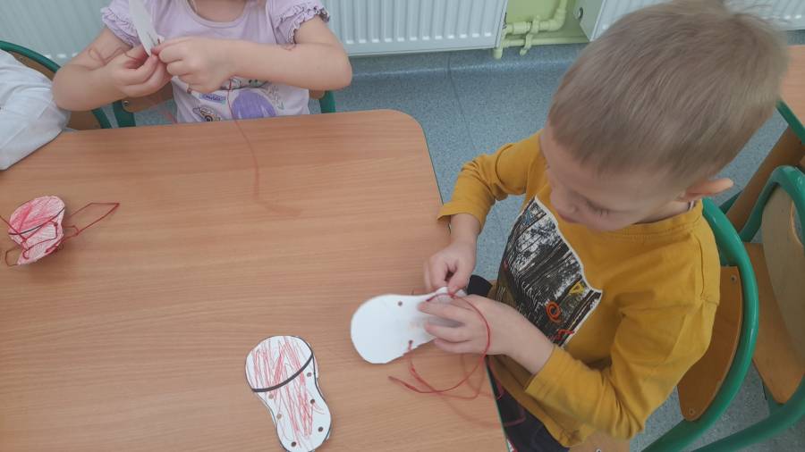 To obszerny temat, który zaplanowano na dwa tygodnie. Dzieci dowiedziały się, jaką pracę wykonuje szewc. /Szyły buty/ przewlekając sznurek przez dziurkę.  Odwiedziły również Panie Kucharki, które chętnie opowiedziały dzieciom o swojej pracy.  Powstały mini pizze.