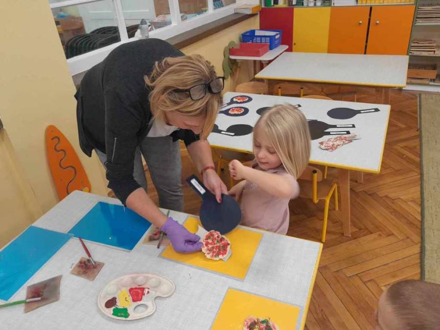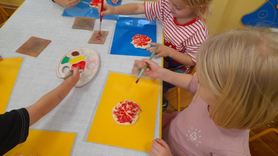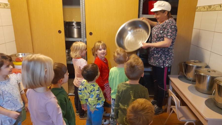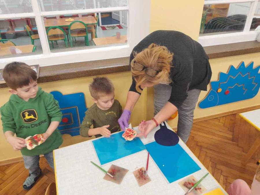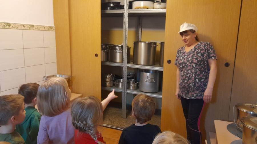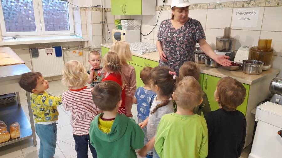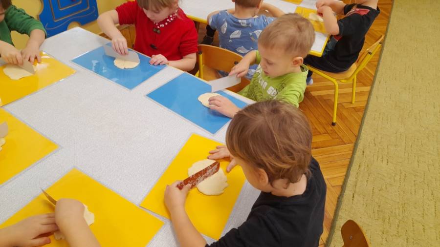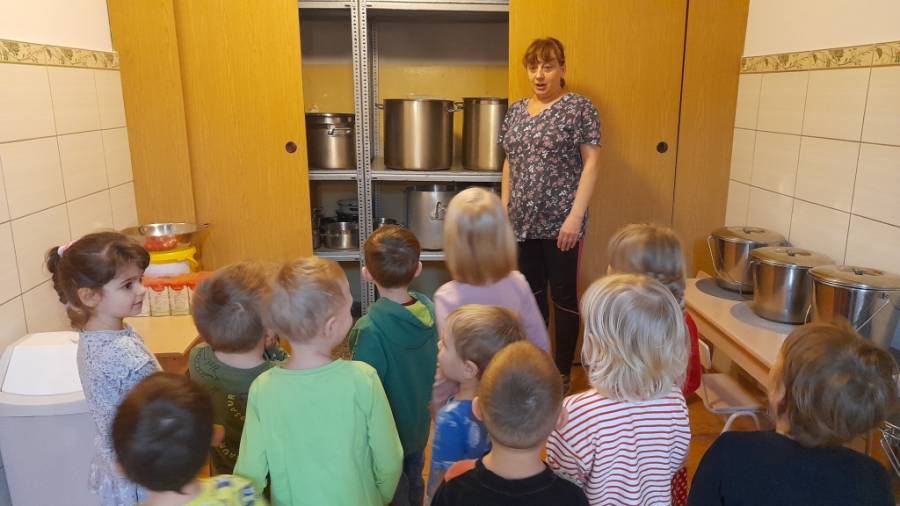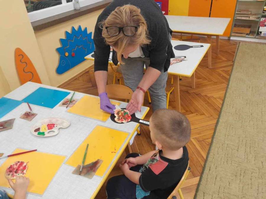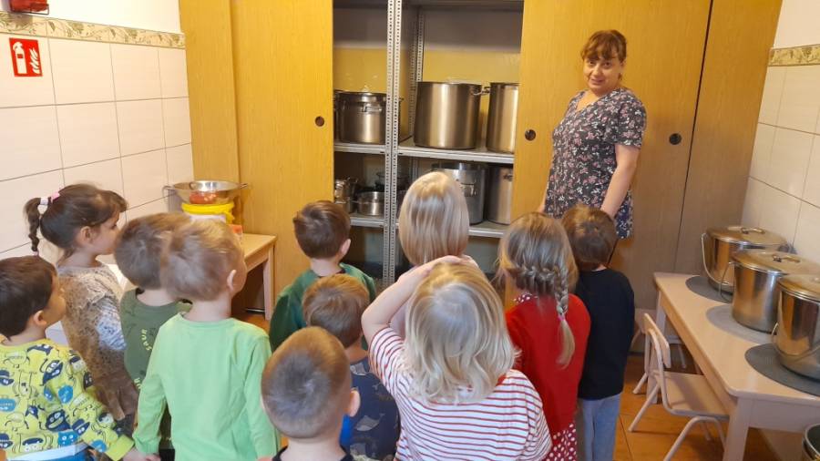 To obszerny temat, który zaplanowano na dwa tygodnie. Dzieci dowiedziały się, jaką pracę wykonuje szewc. /Szyły buty/ przewlekając sznurek przez dziurkę.  Odwiedziły również Panie Kucharki, które chętnie opowiedziały dzieciom o swojej pracy.  Powstały mini pizze.