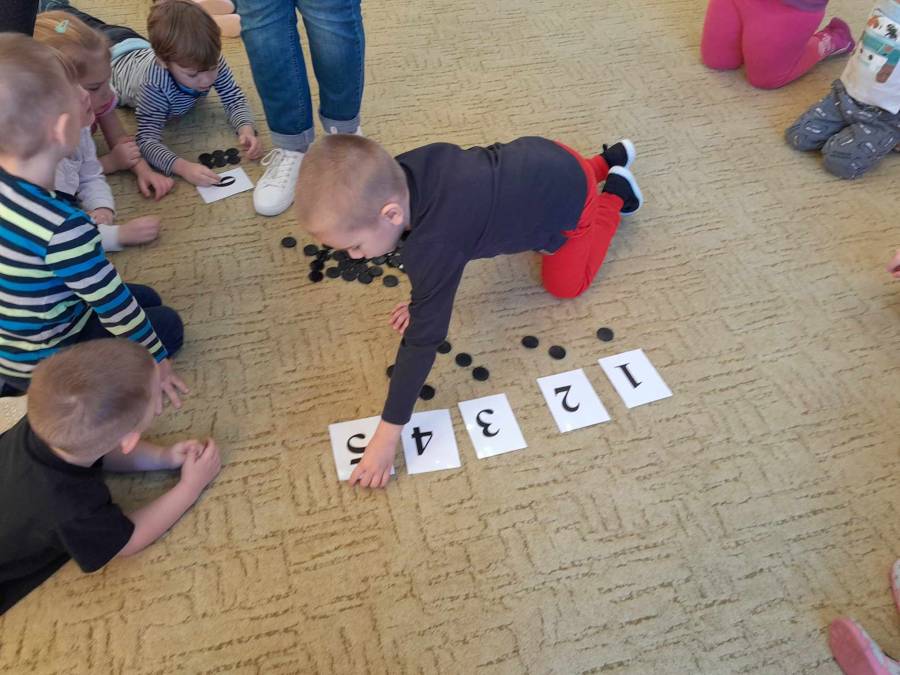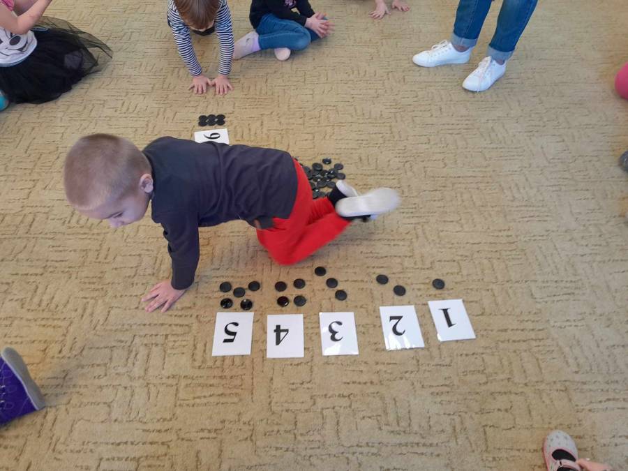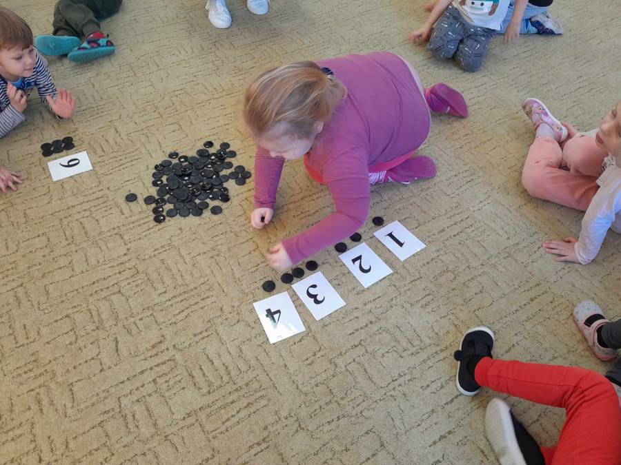Omawiając temat Krawcowej, do zabawy posłużyły nam guziki. Dzieci, zwłaszcza starsze bardzo dobrze liczą, a nawet niektóre potrafią przyporządkować guziki do odpowiedniej cyfry. Brawo!