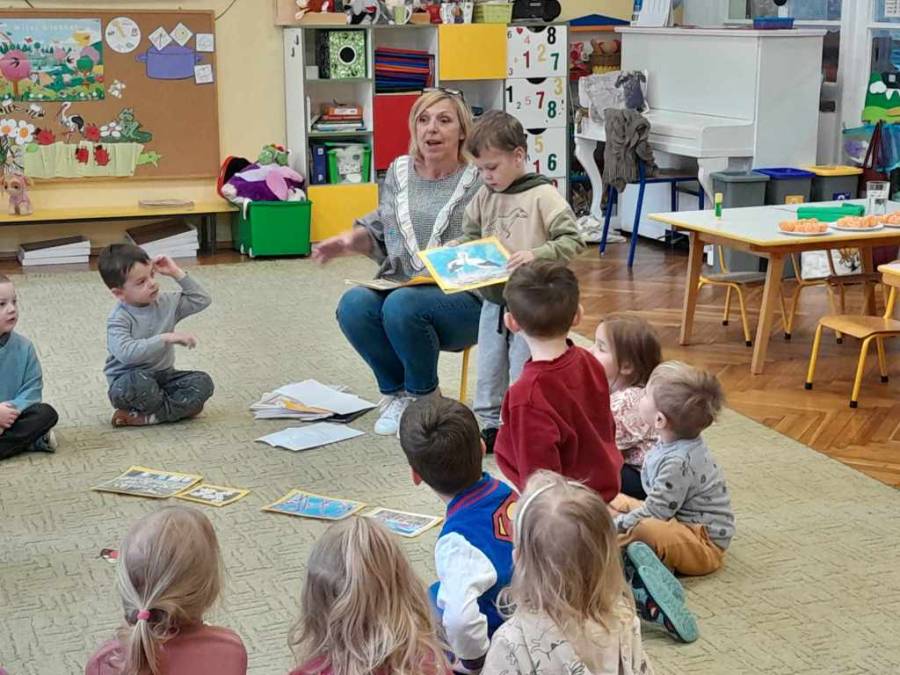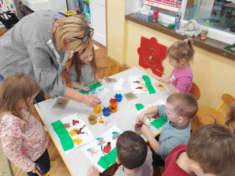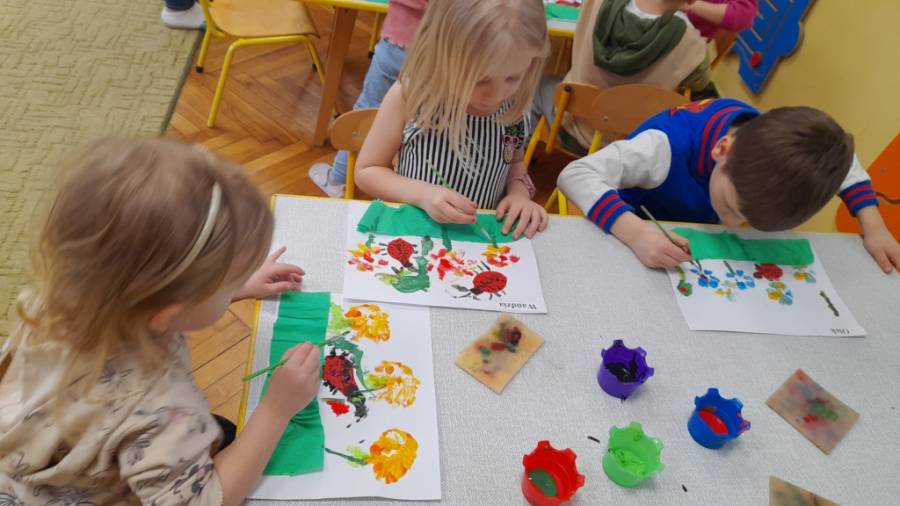 Dzisiejsze zajęcia poświęcone były wiośnie. Dzieci szukały ukrytych w sali obrazków przedstawiających oznaki wiosny. Chętnie wypowiadały się na temat /Co zwiastuje nadejście nowej pory roku?/. Dostały też list w formie wiersza, którego nadawcą była Pani Wiosna, a po jego przeczytaniu przystąpiły do pracy twórczej. Posługując się napompowanym woreczkiem foliowym, malowały kwiaty, wycinały biedronki.