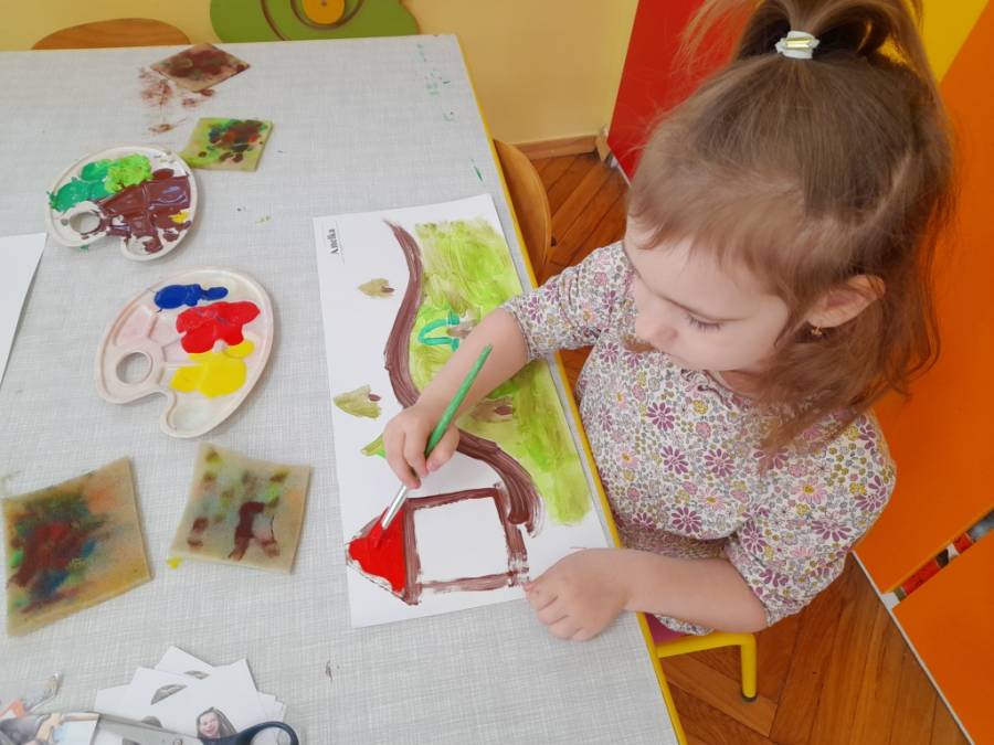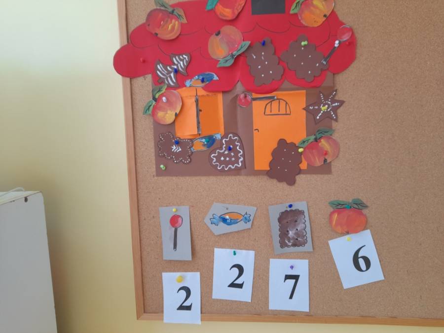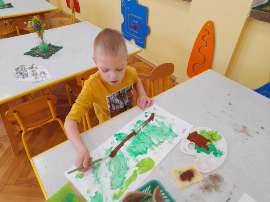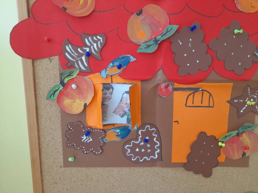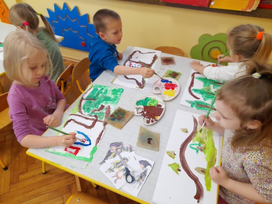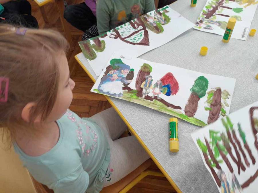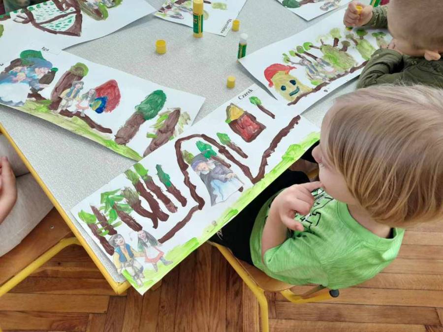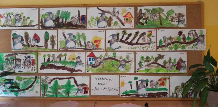/Kraina bajek i baśni/ to temat, który dzieci bardzo lubią. Poszerzono go o zabawę dydaktyczną i twórczą. Znając dobrze treść bajki /Jaś i Małgosia/, dzieci odpowiadały na zadane pytania, wyszukiwały i przeliczały elementy znajdujące się na domku Baby Jagi. Chętnie zilustrowały bajkę, wykorzystując farby gwaszowe oraz sylwety postaci. Stoliki po pracy nie wyglądały najlepiej - jak to w pracowni plastycznej. Natomiast obrazy można podziwiać - są estetyczne, odznaczają się bogatą wyobraźnią i wrażliwością.