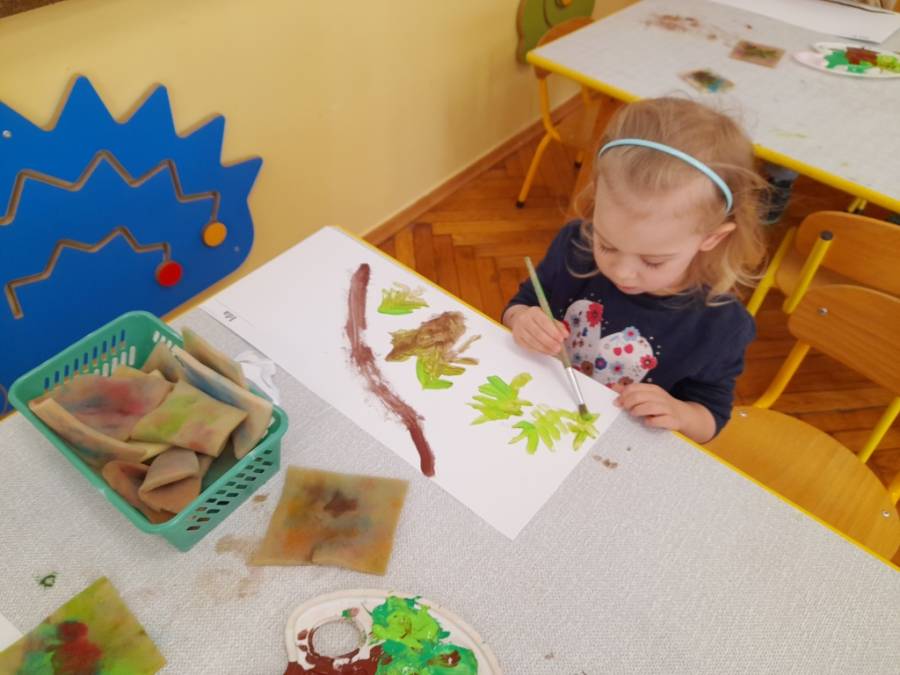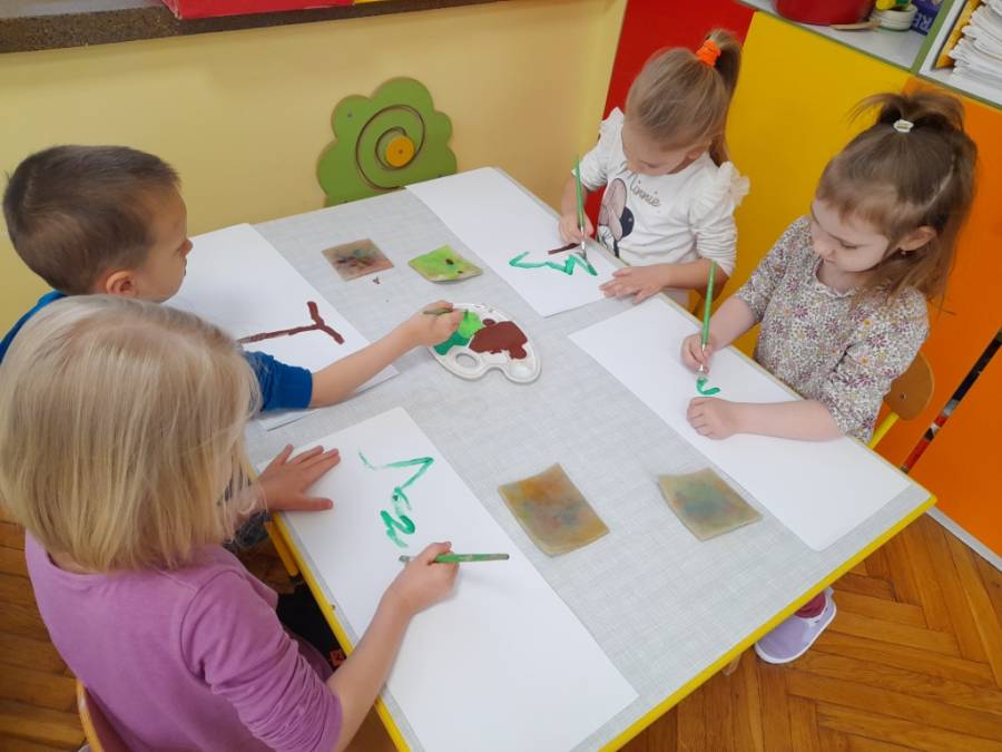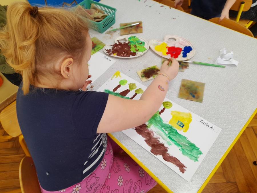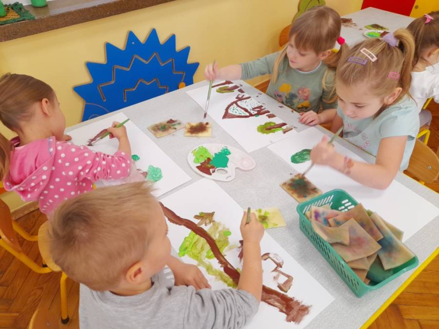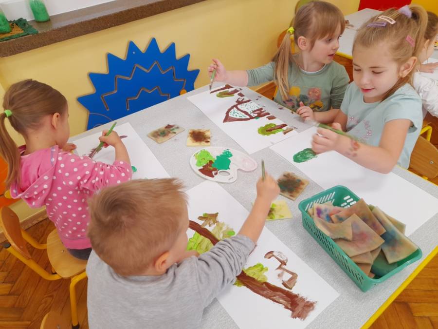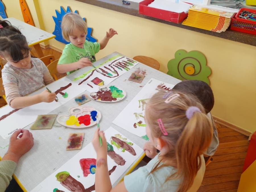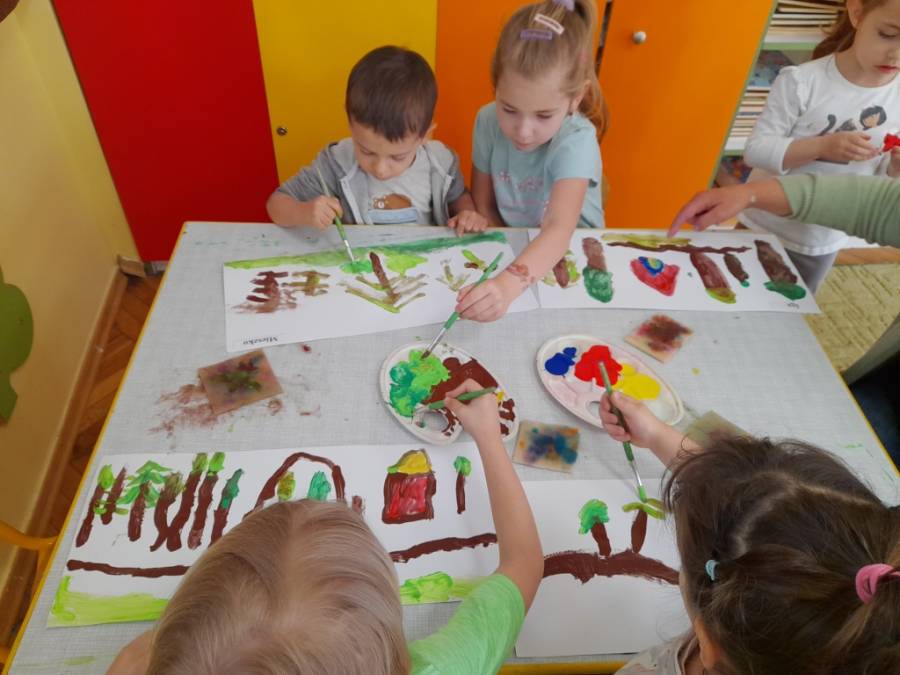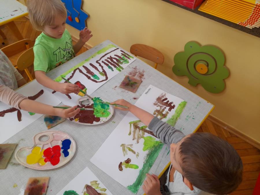 /Kraina bajek i baśni/ to temat, który dzieci bardzo lubią. Poszerzono go o zabawę dydaktyczną i twórczą. Znając dobrze treść bajki /Jaś i Małgosia/, dzieci odpowiadały na zadane pytania, wyszukiwały i przeliczały elementy znajdujące się na domku Baby Jagi. Chętnie zilustrowały bajkę, wykorzystując farby gwaszowe oraz sylwety postaci. Stoliki po pracy nie wyglądały najlepiej - jak to w pracowni plastycznej. Natomiast obrazy można podziwiać - są estetyczne, odznaczają się bogatą wyobraźnią i wrażliwością.