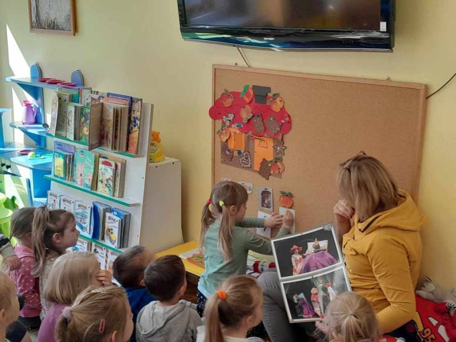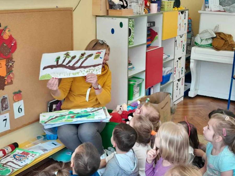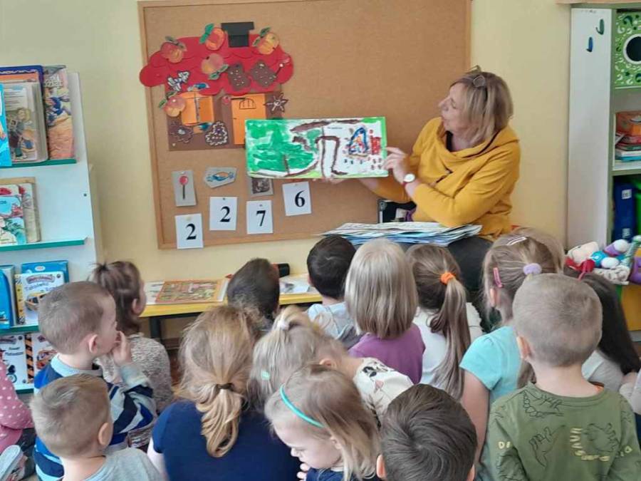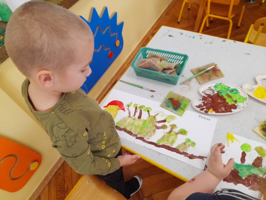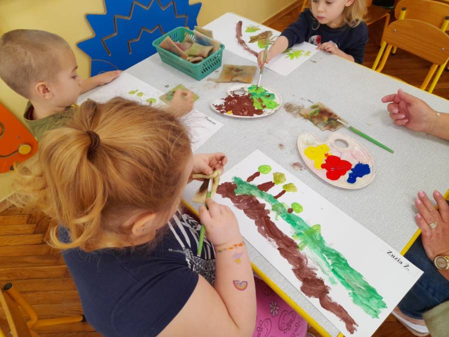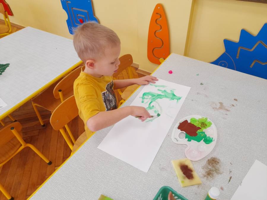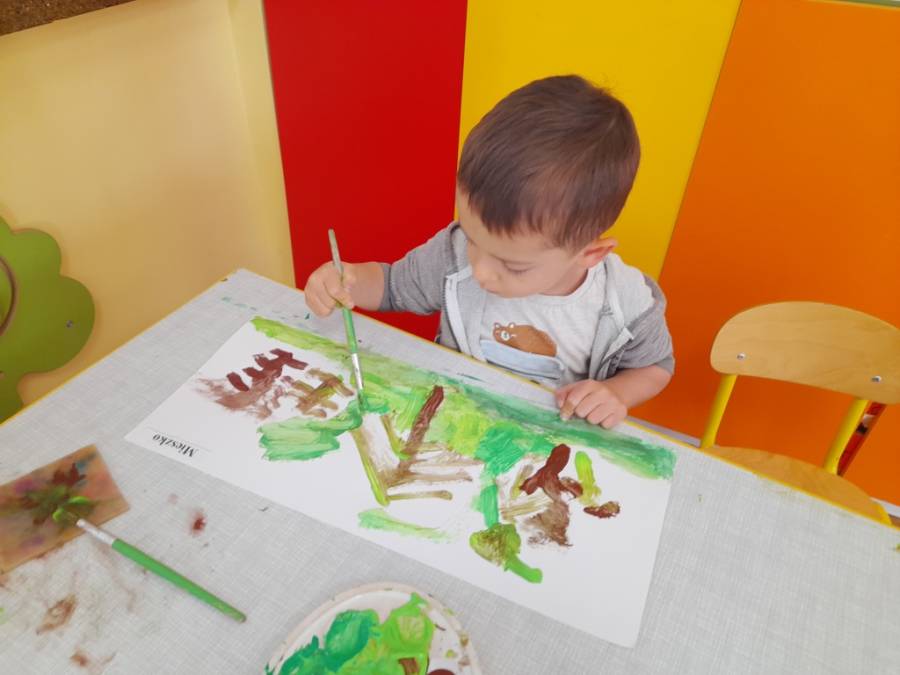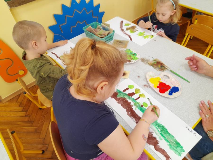 /Kraina bajek i baśni/ to temat, który dzieci bardzo lubią. Poszerzono go o zabawę dydaktyczną i twórczą. Znając dobrze treść bajki /Jaś i Małgosia/, dzieci odpowiadały na zadane pytania, wyszukiwały i przeliczały elementy znajdujące się na domku Baby Jagi. Chętnie zilustrowały bajkę, wykorzystując farby gwaszowe oraz sylwety postaci. Stoliki po pracy nie wyglądały najlepiej - jak to w pracowni plastycznej. Natomiast obrazy można podziwiać - są estetyczne, odznaczają się bogatą wyobraźnią i wrażliwością.