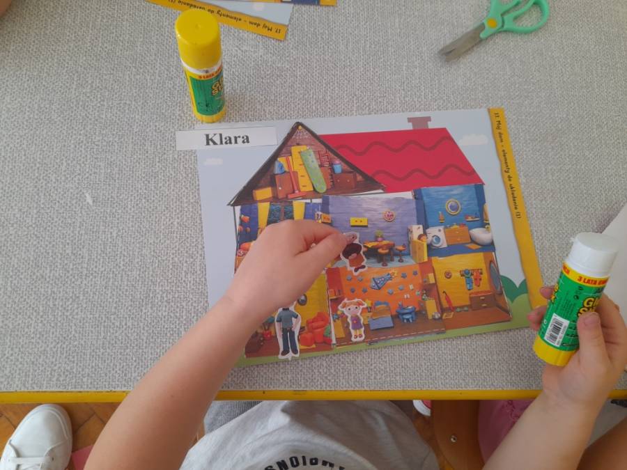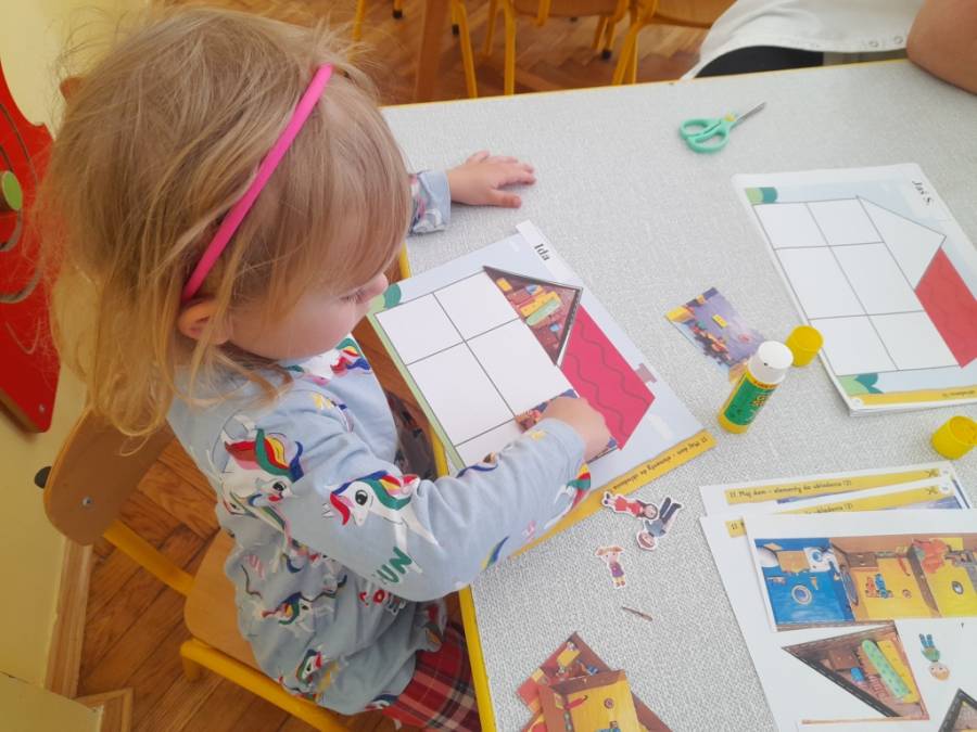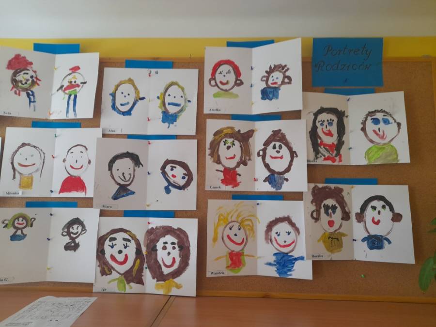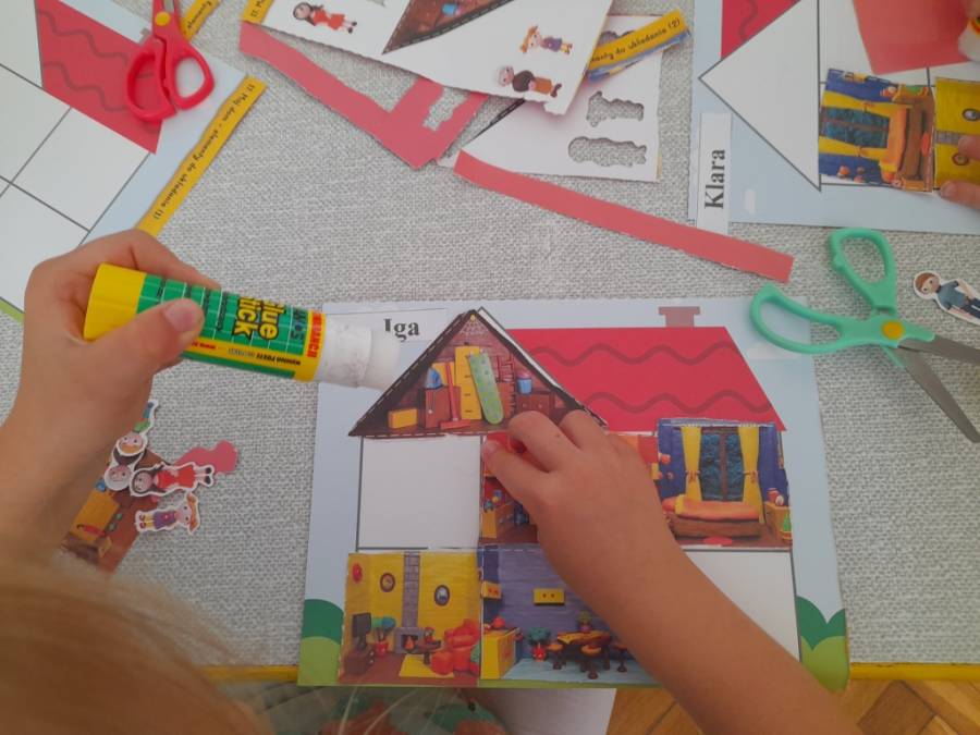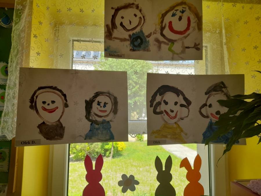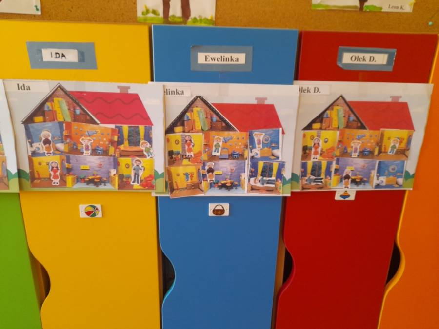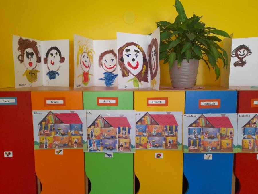 Podczas dzisiejszych zajęć, dzieci wypowiadały się na temat swojej rodziny. Wiedzą, że na bliskich zawsze mogą polegać. Dużą radość sprawiło dzieciom wycinanie obrazków przedstawiających wnętrza mieszkań i wklejanie ich w odpowiednie miejsca na szablonie domu. Możemy również pochwalić się portretami rodziców.