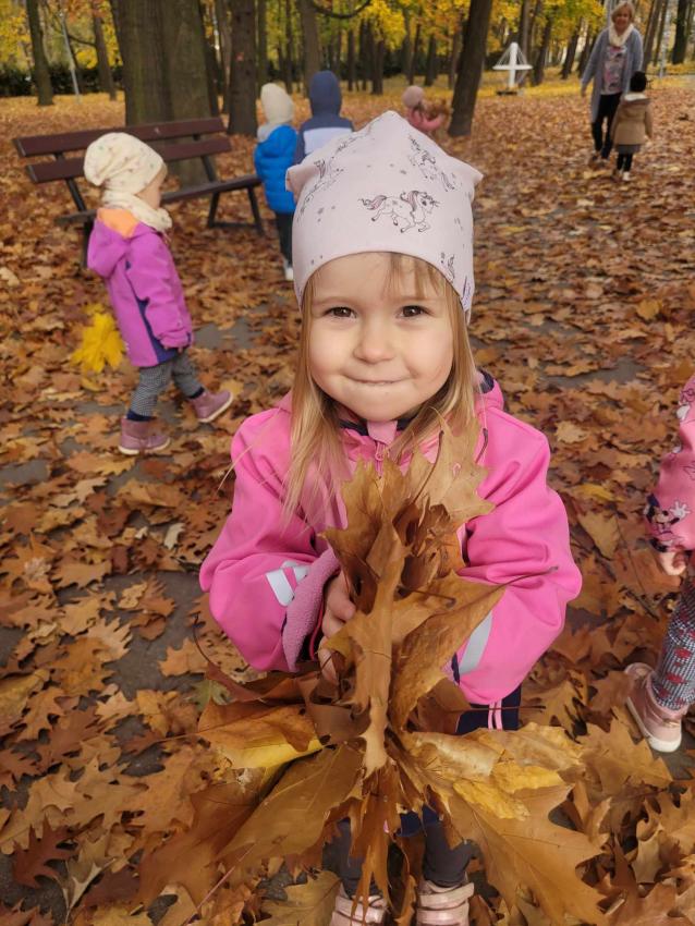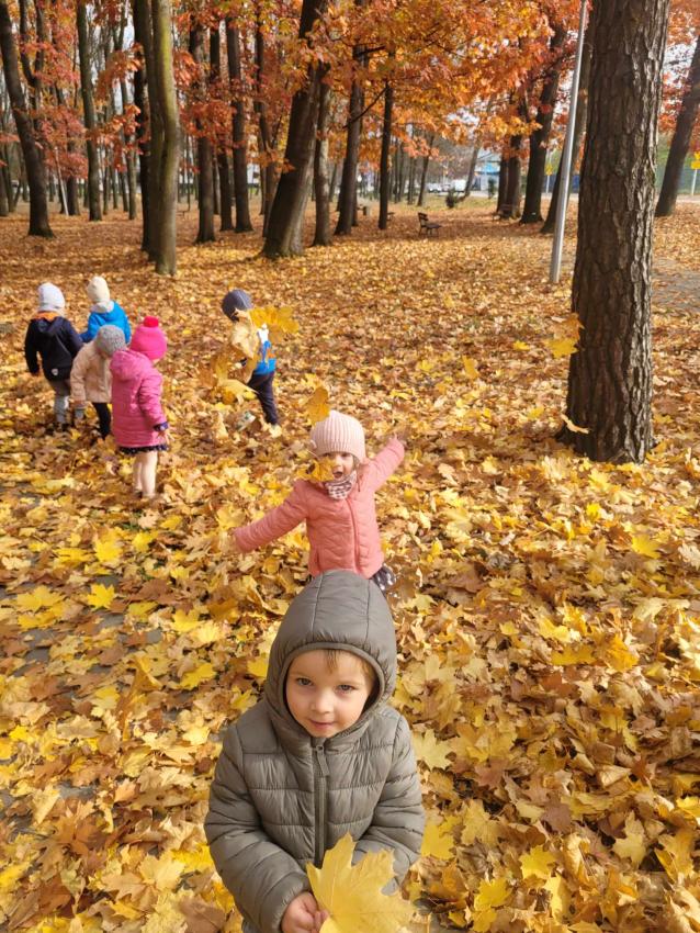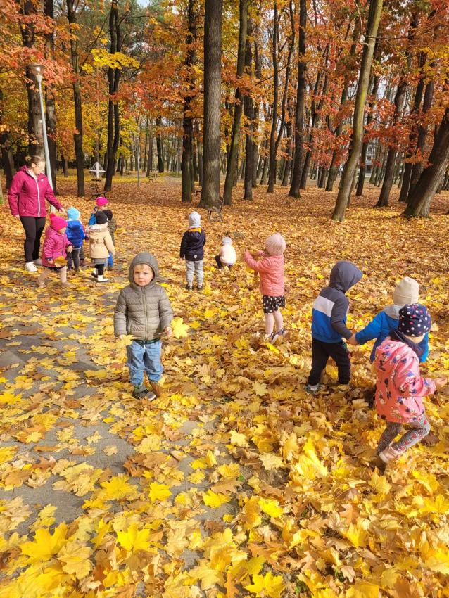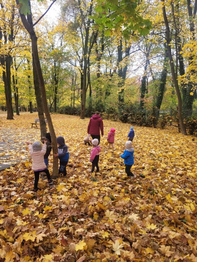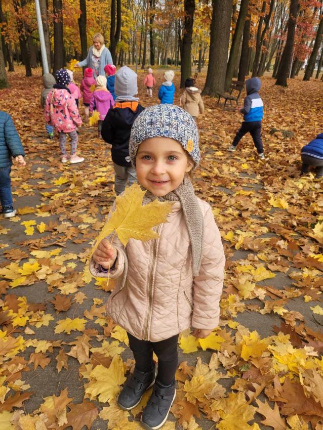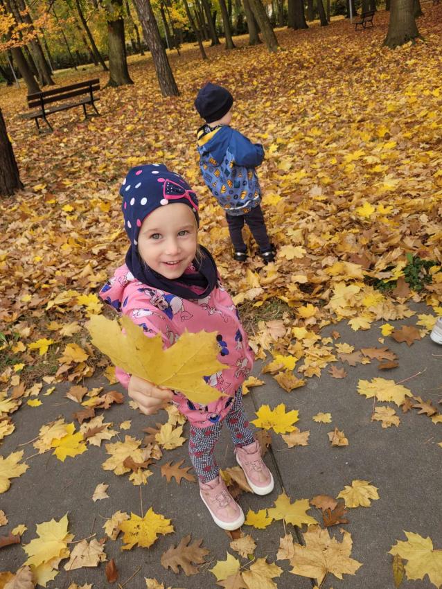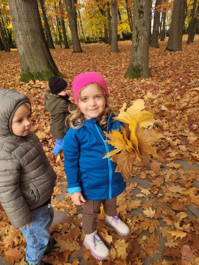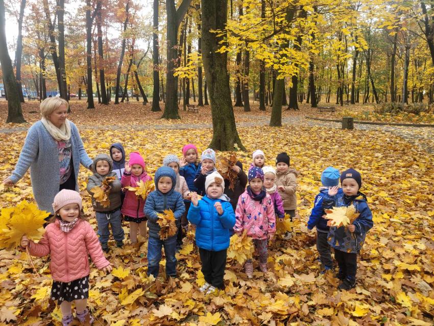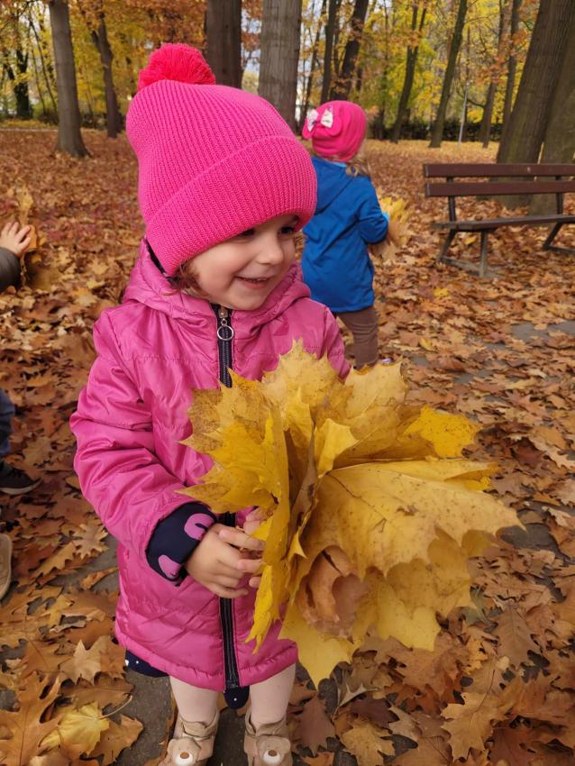 Korzystając z pięknej pogody  Nasze Pszczółki  wybrały się na swój pierwszy spacer do parku gdzie podziwiały piękną jesień wokół nas .