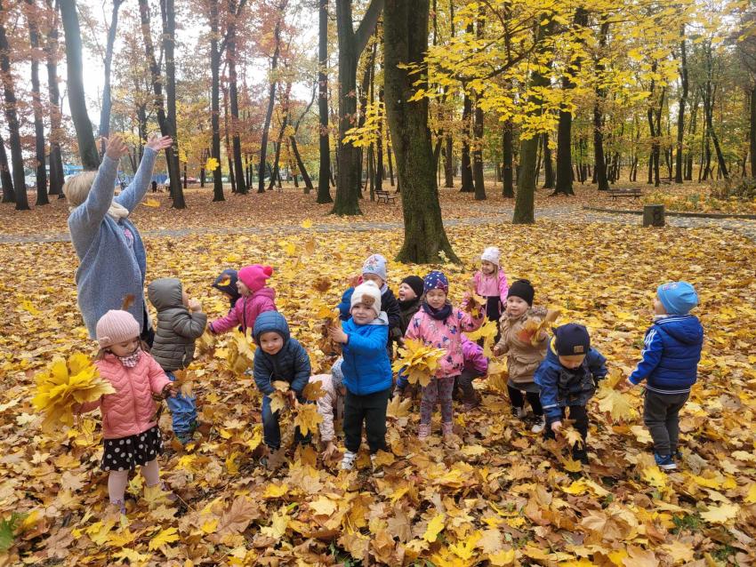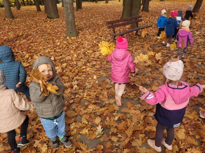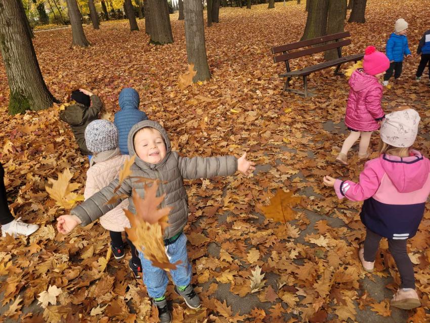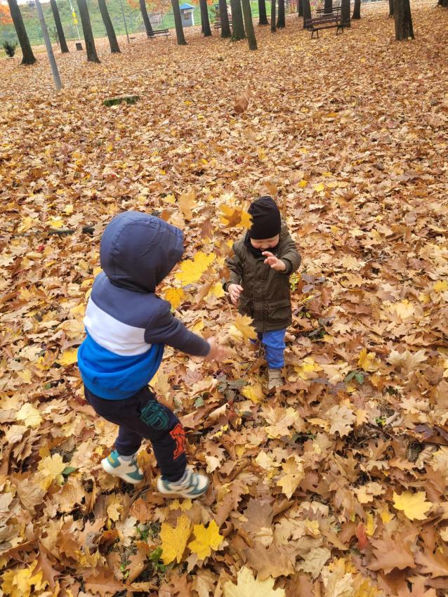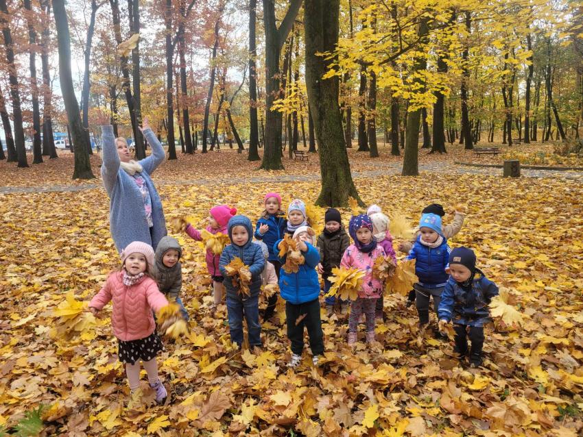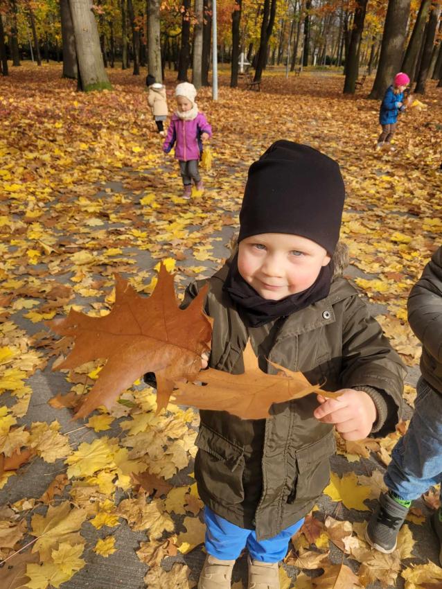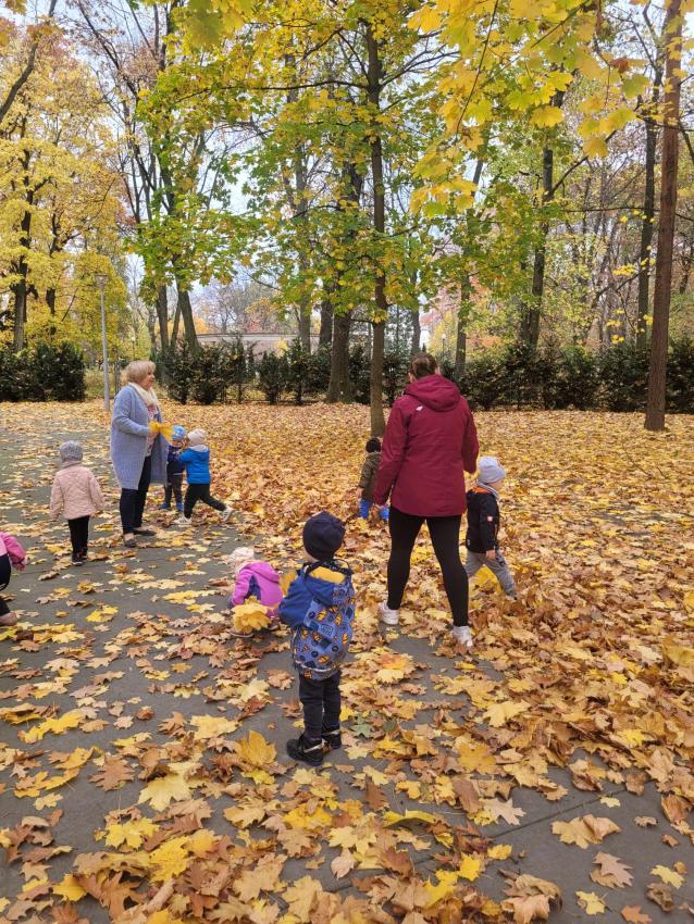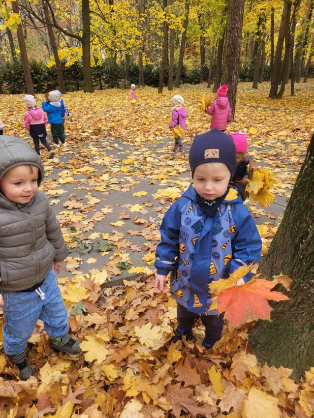 Korzystając z pięknej pogody  Nasze Pszczółki  wybrały się na swój pierwszy spacer do parku gdzie podziwiały piękną jesień wokół nas .