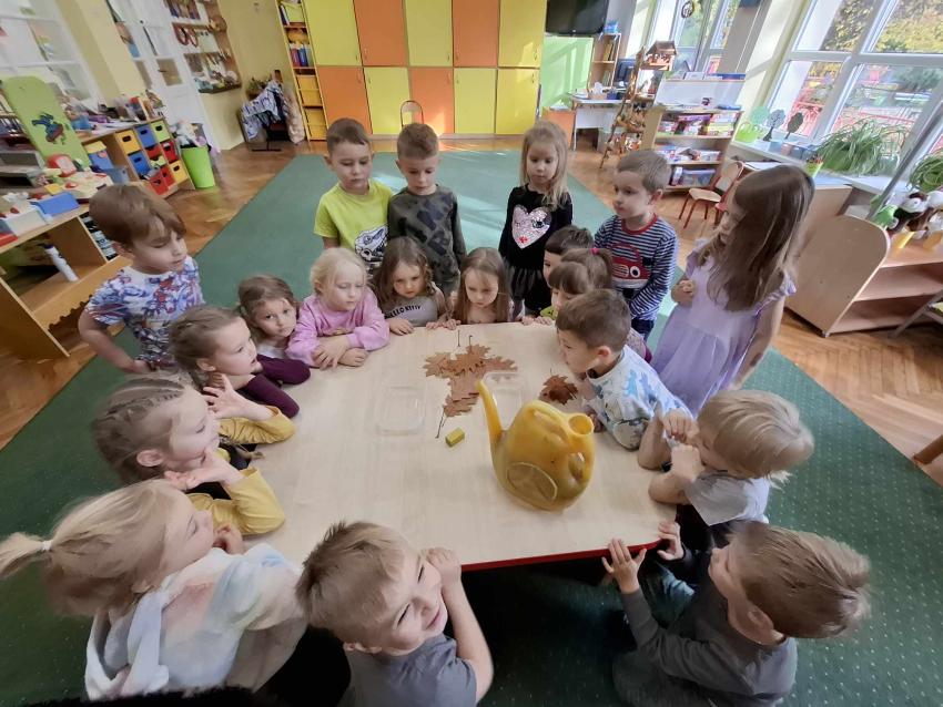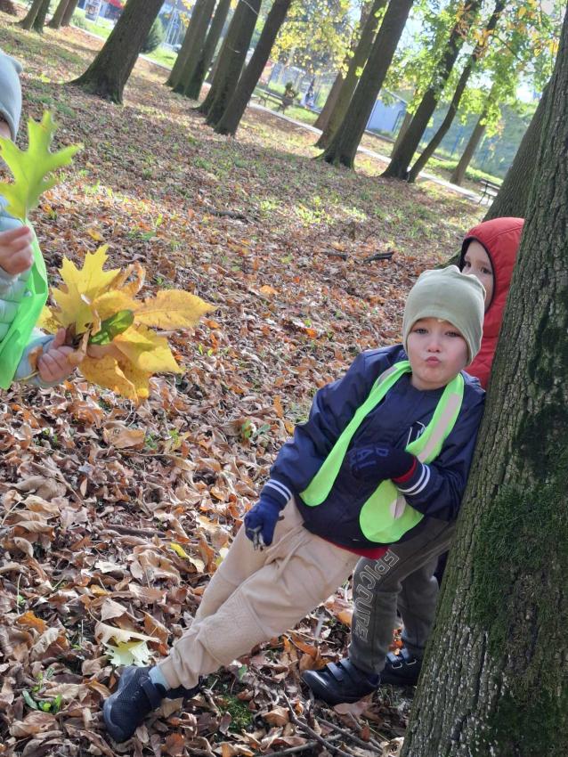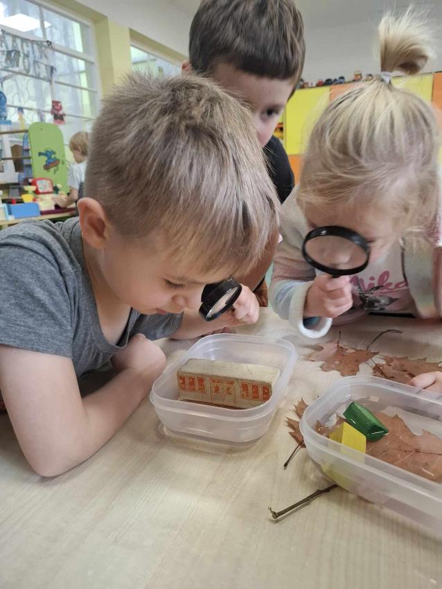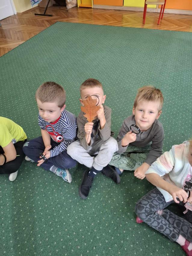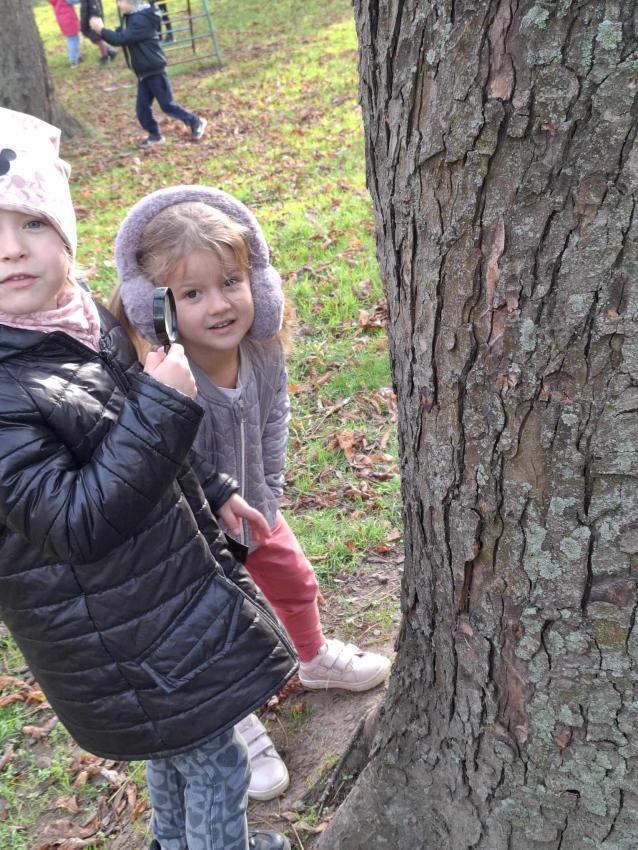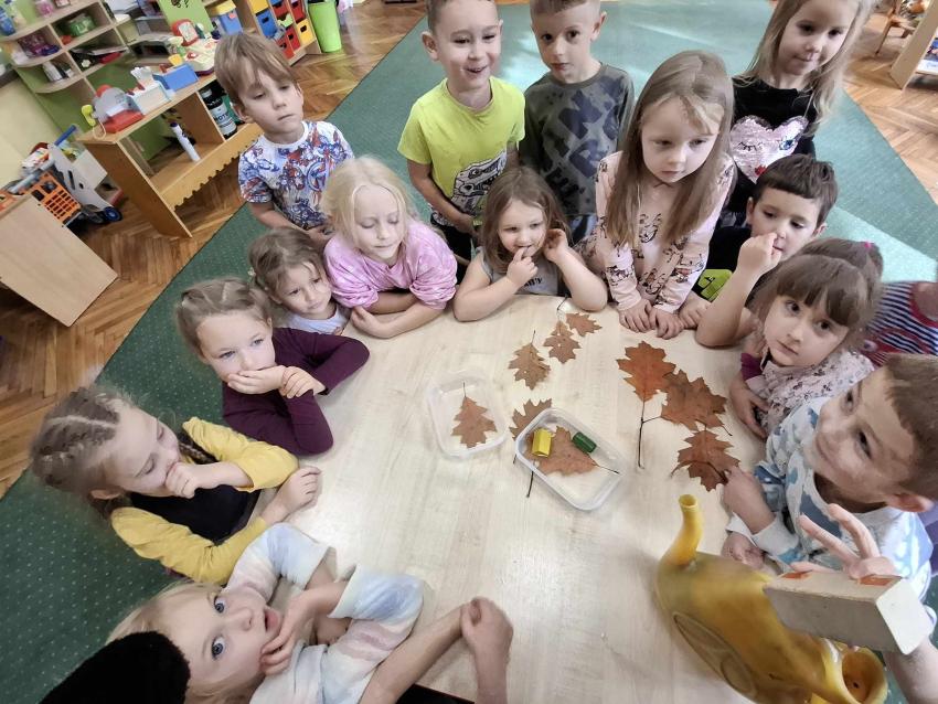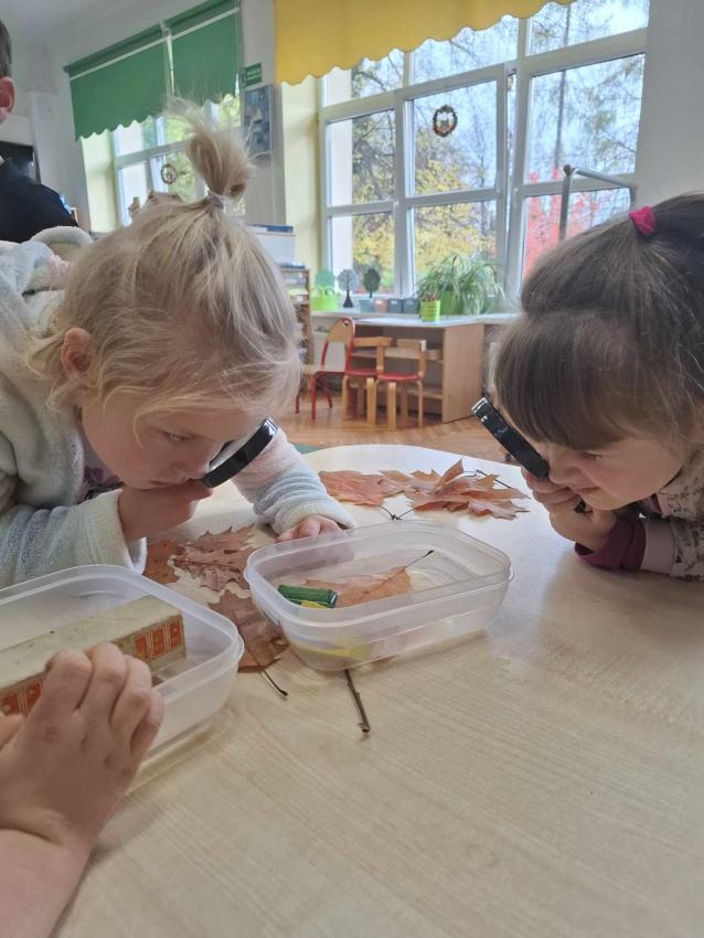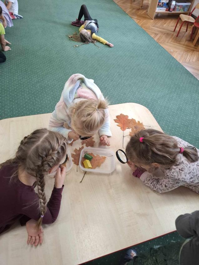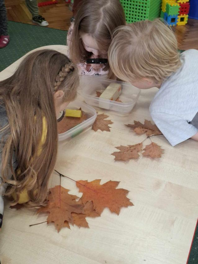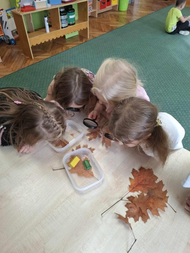 Pajacyki biorą udział w projekcie Mali Wielcy Odkrywcy w związku z tym przeprowadziły pierwsze doświadczenie z kolorowymi liśćmi " W jaki sposób oddychają drzewa" . Dzieci do przygotowanego pojemnika z wodą włożyły listek, przygniotły listek klockiem i postawiły pojemnik w nasłonecznionym miejscu. Po kilku minutach pojawiły się efekty ( bąbelki na liściu). Doświadczenia to świetna zabawa, która pozwala obserwować, wyciągać wnioski, analizować. Poznały również trudne słowa fotosynteza oraz chlorofil, a także dowiedziały się dlaczego liście zmieniają kolor jesienią. Dzieci wzięły udział w spacerze badawczym ,,polowanie na drzewa'', podczas którego poszukiwały drzew oraz obserwowały i porównywały kolory liści różnych drzew.