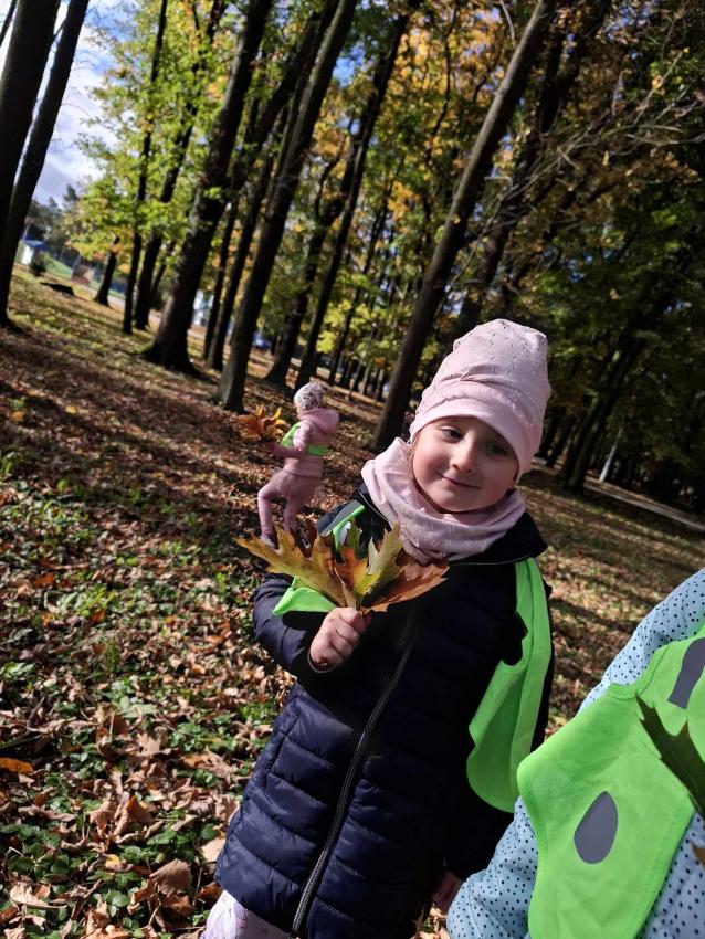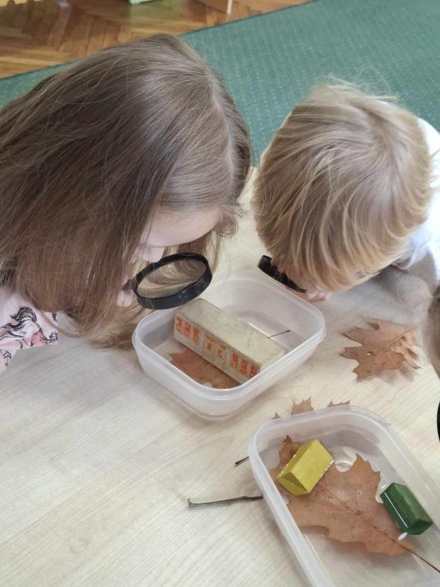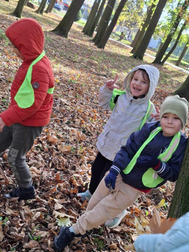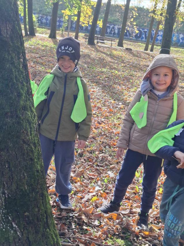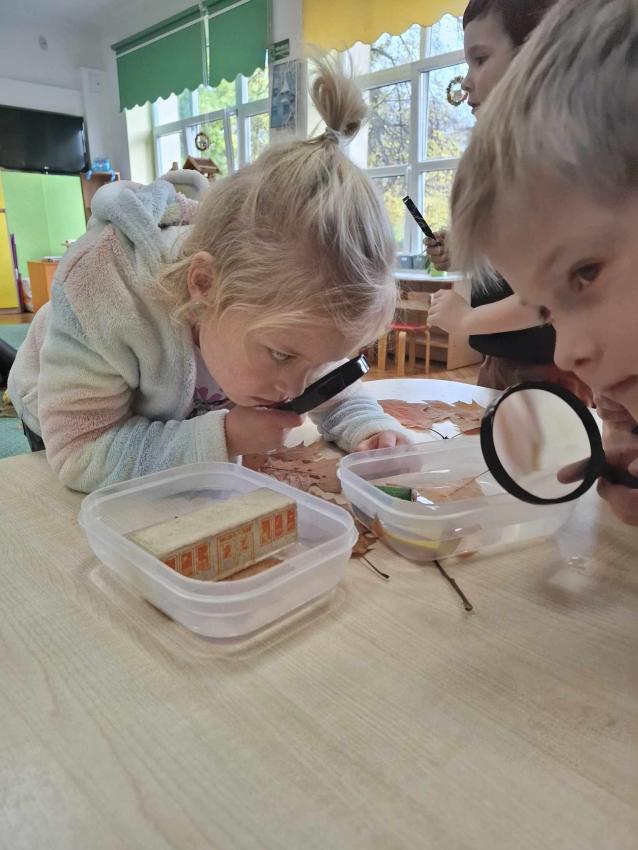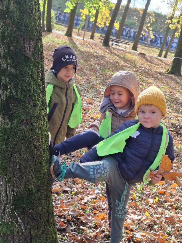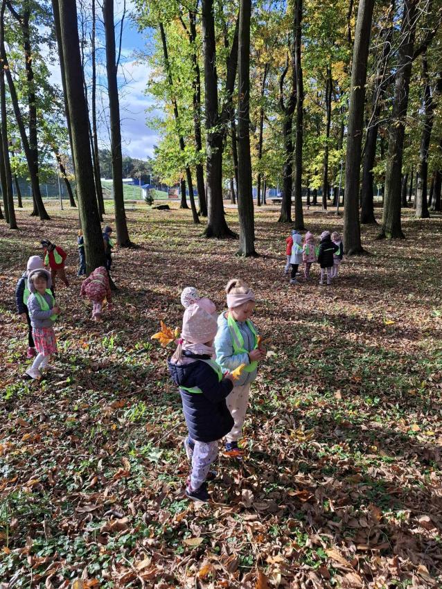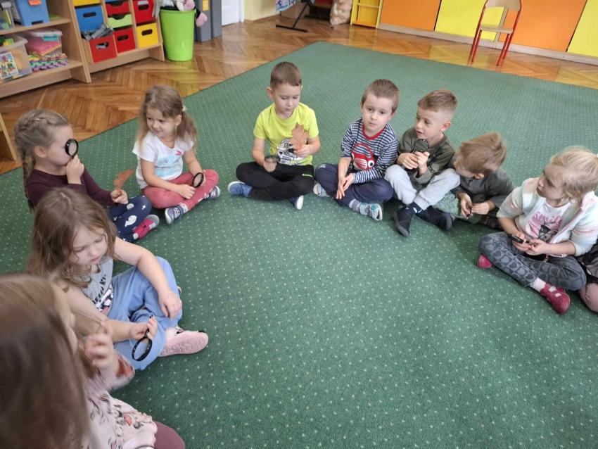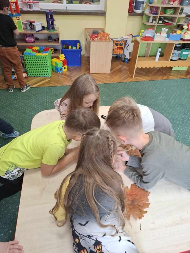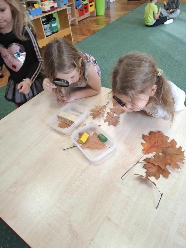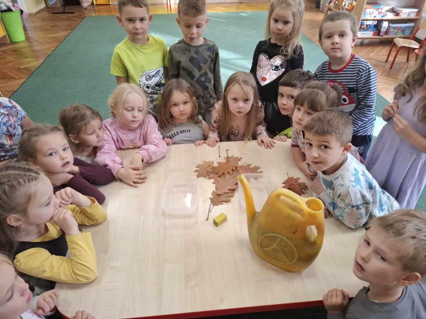 Pajacyki biorą udział w projekcie Mali Wielcy Odkrywcy w związku z tym przeprowadziły pierwsze doświadczenie z kolorowymi liśćmi " W jaki sposób oddychają drzewa" . Dzieci do przygotowanego pojemnika z wodą włożyły listek, przygniotły listek klockiem i postawiły pojemnik w nasłonecznionym miejscu. Po kilku minutach pojawiły się efekty ( bąbelki na liściu). Doświadczenia to świetna zabawa, która pozwala obserwować, wyciągać wnioski, analizować. Poznały również trudne słowa fotosynteza oraz chlorofil, a także dowiedziały się dlaczego liście zmieniają kolor jesienią. Dzieci wzięły udział w spacerze badawczym ,,polowanie na drzewa'', podczas którego poszukiwały drzew oraz obserwowały i porównywały kolory liści różnych drzew.