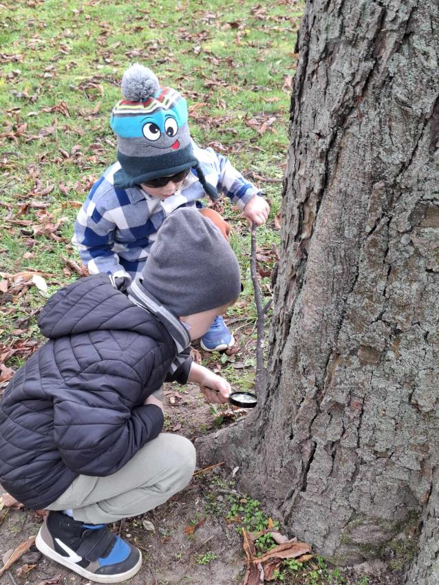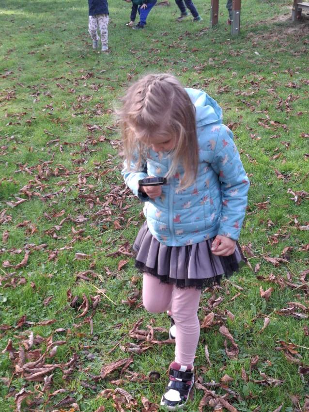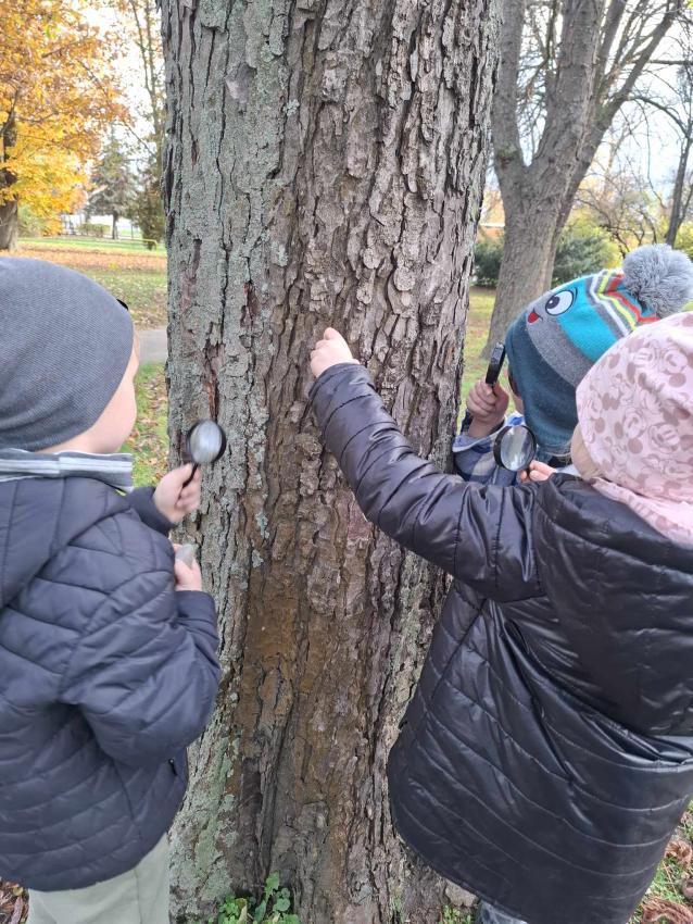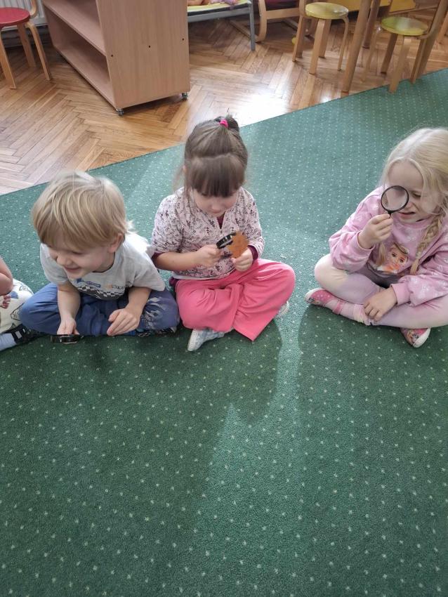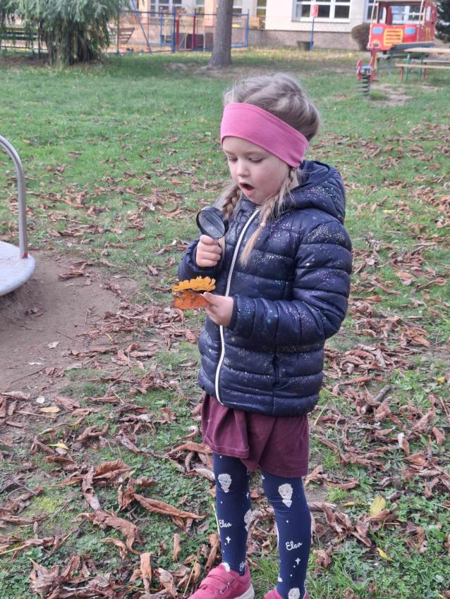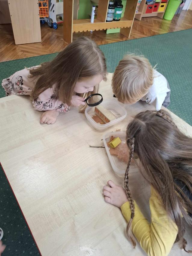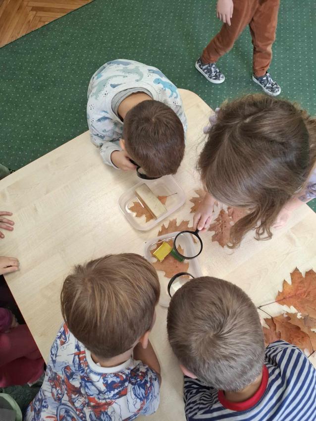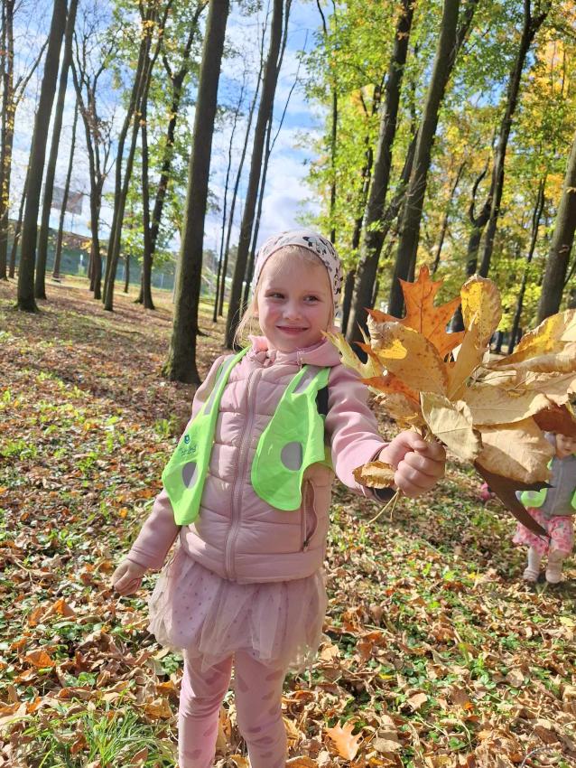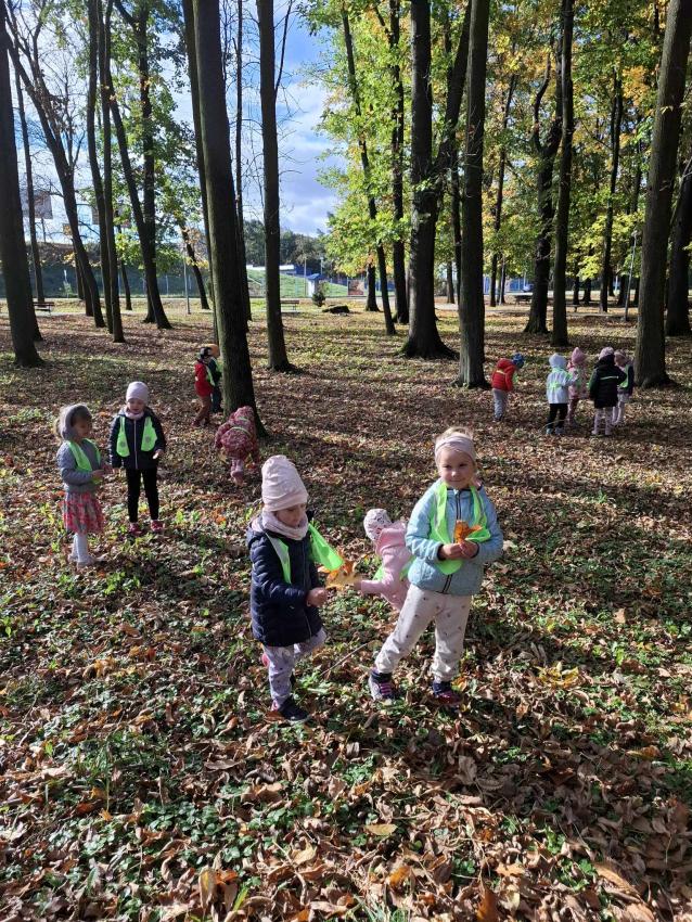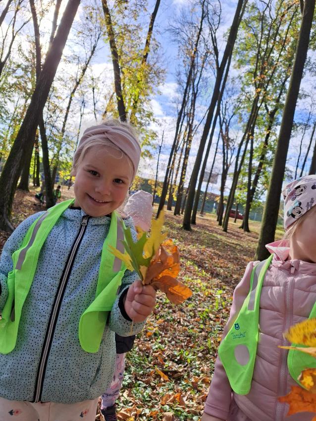 Pajacyki biorą udział w projekcie Mali Wielcy Odkrywcy w związku z tym przeprowadziły pierwsze doświadczenie z kolorowymi liśćmi " W jaki sposób oddychają drzewa" . Dzieci do przygotowanego pojemnika z wodą włożyły listek, przygniotły listek klockiem i postawiły pojemnik w nasłonecznionym miejscu. Po kilku minutach pojawiły się efekty ( bąbelki na liściu). Doświadczenia to świetna zabawa, która pozwala obserwować, wyciągać wnioski, analizować. Poznały również trudne słowa fotosynteza oraz chlorofil, a także dowiedziały się dlaczego liście zmieniają kolor jesienią. Dzieci wzięły udział w spacerze badawczym ,,polowanie na drzewa'', podczas którego poszukiwały drzew oraz obserwowały i porównywały kolory liści różnych drzew.