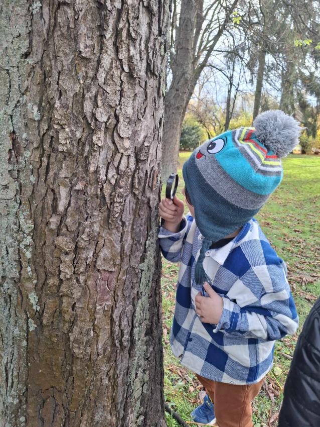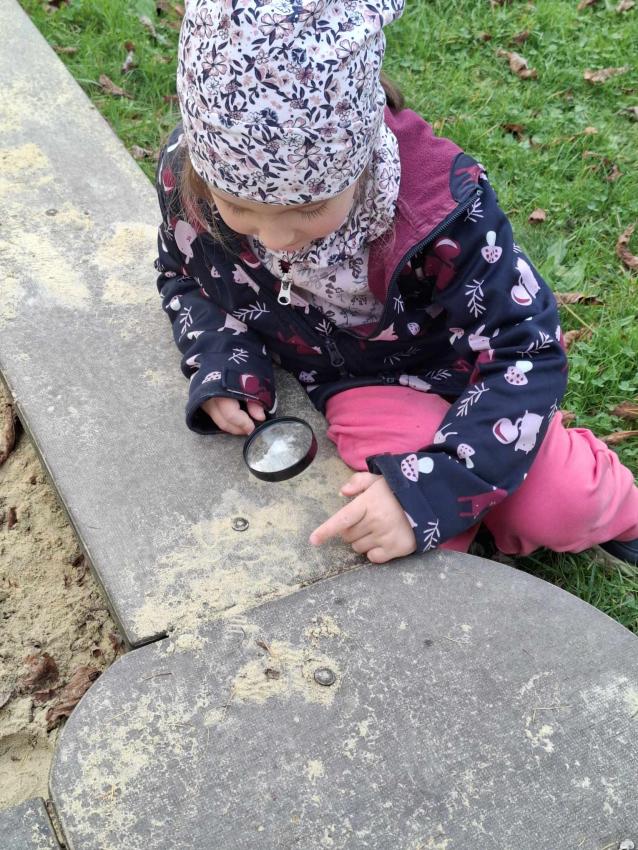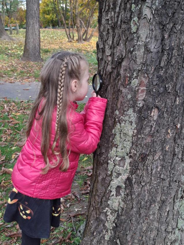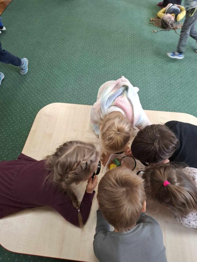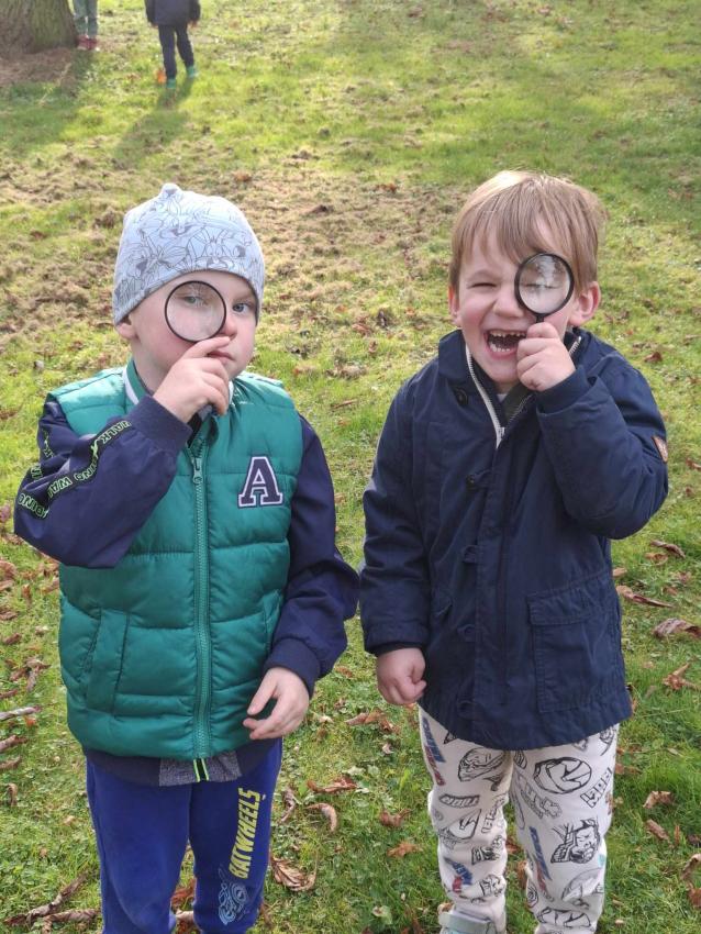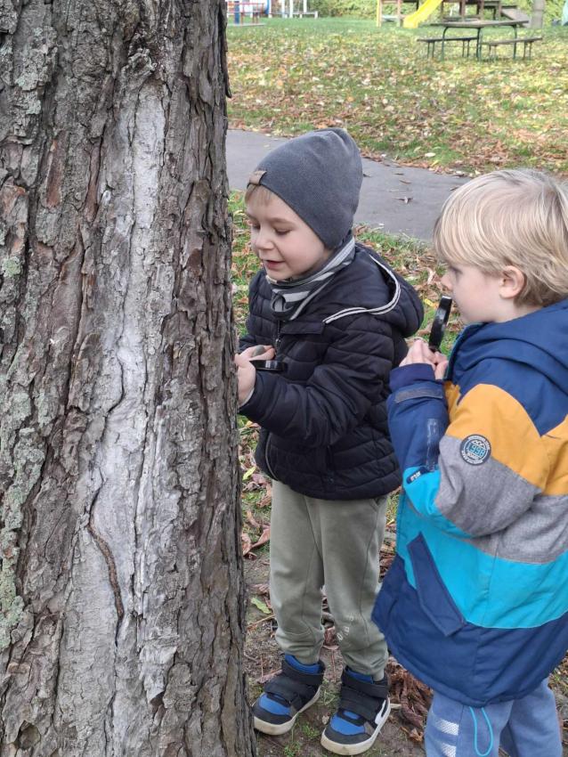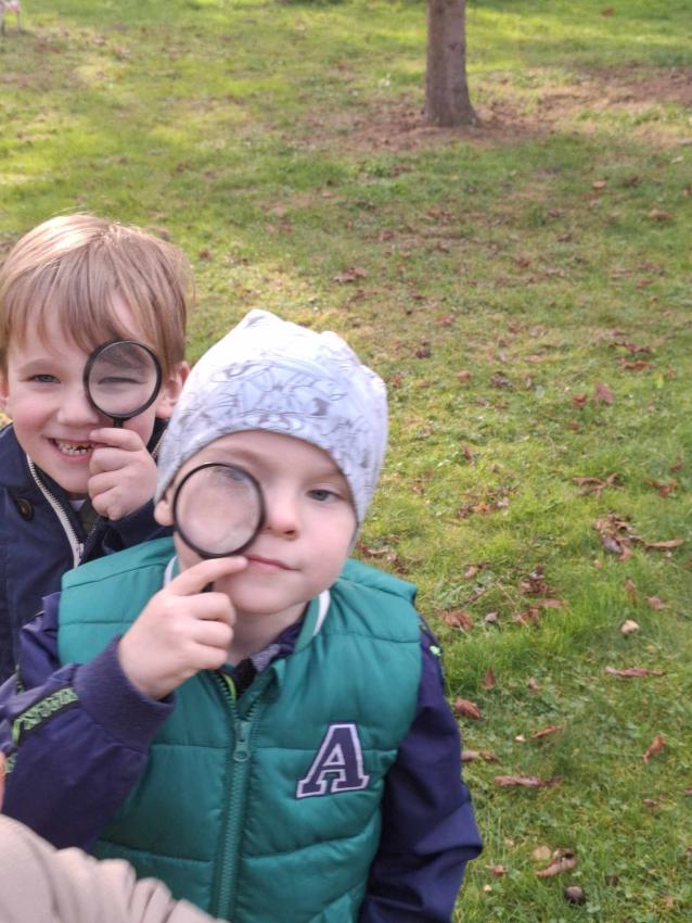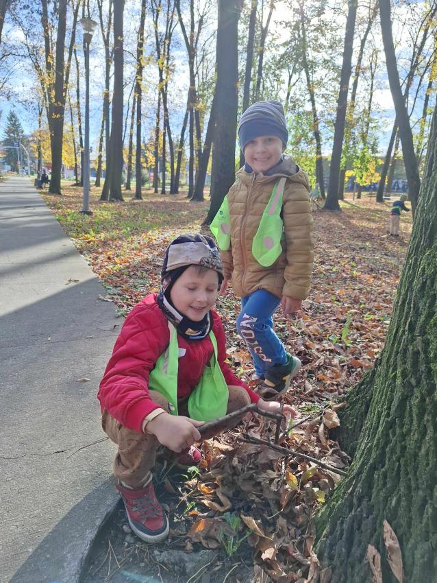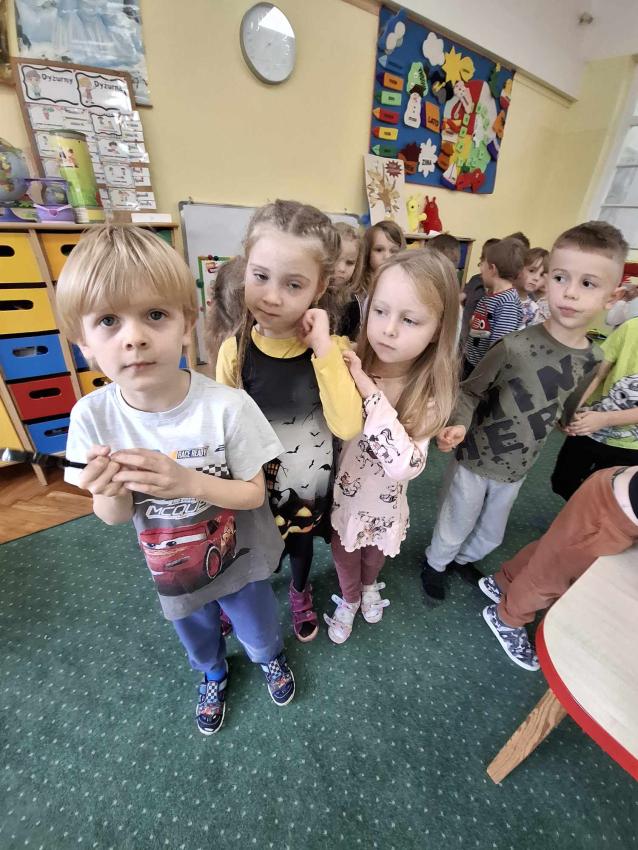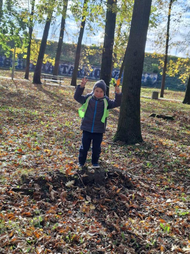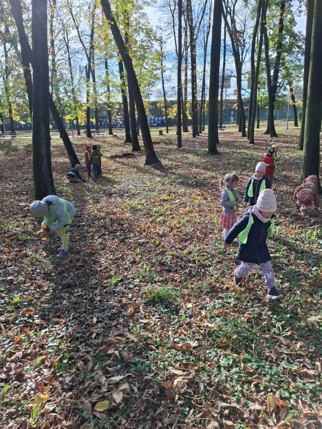 Pajacyki biorą udział w projekcie Mali Wielcy Odkrywcy w związku z tym przeprowadziły pierwsze doświadczenie z kolorowymi liśćmi " W jaki sposób oddychają drzewa" . Dzieci do przygotowanego pojemnika z wodą włożyły listek, przygniotły listek klockiem i postawiły pojemnik w nasłonecznionym miejscu. Po kilku minutach pojawiły się efekty ( bąbelki na liściu). Doświadczenia to świetna zabawa, która pozwala obserwować, wyciągać wnioski, analizować. Poznały również trudne słowa fotosynteza oraz chlorofil, a także dowiedziały się dlaczego liście zmieniają kolor jesienią. Dzieci wzięły udział w spacerze badawczym ,,polowanie na drzewa'', podczas którego poszukiwały drzew oraz obserwowały i porównywały kolory liści różnych drzew.