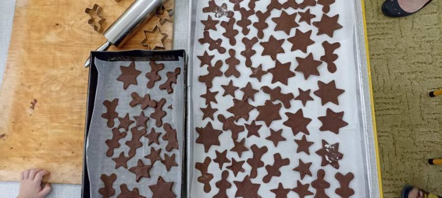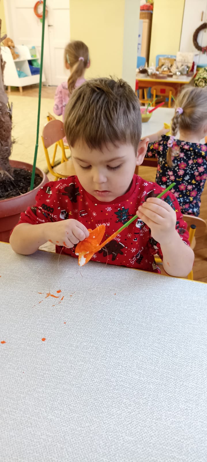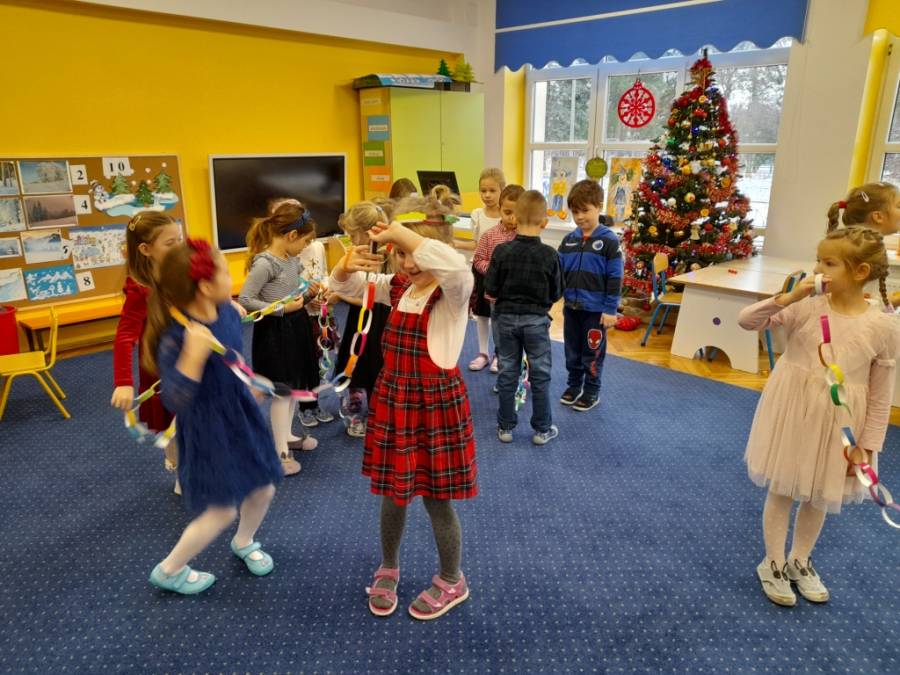 Przy dźwiękach kolęd tworzenie kolorowych łańcuchów. Okazjonalne porównywanie, który większy, który mniejszy. Ozdabianie nim choinki.