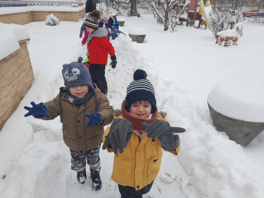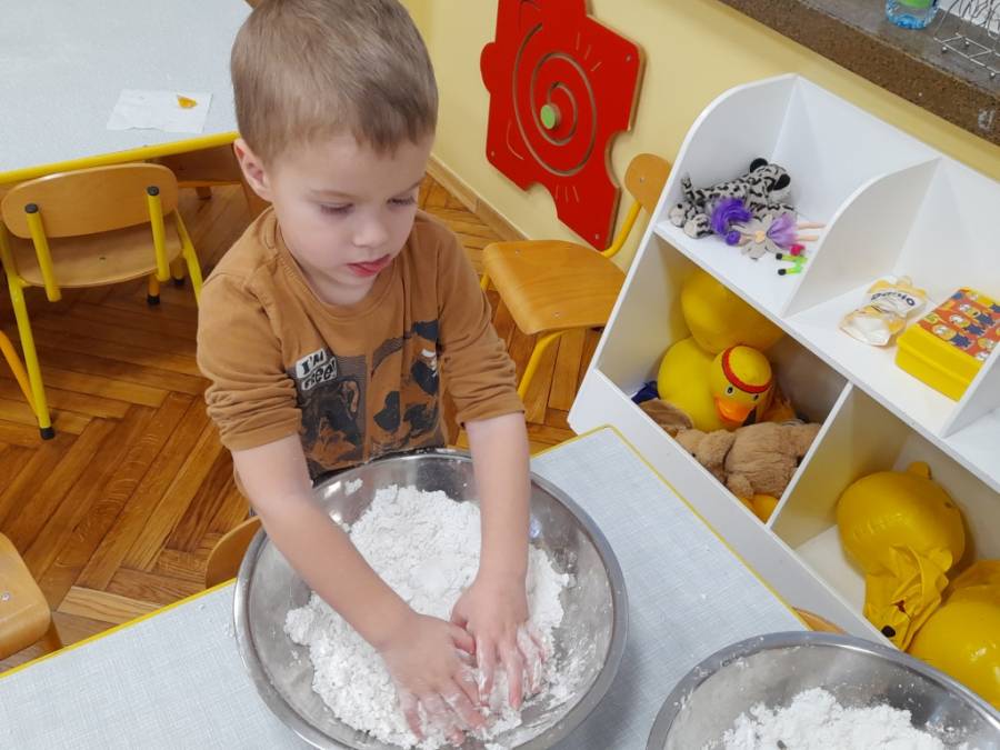 Śnieg w przedszkolu to w naszej grupie nowość. Do zajęć wykorzystano masę wykonaną z mąki ziemniaczanej i oleju. Zajęcia te, pobudziły zmysły takie jak: zmysł dotyku, słuchu oraz wzroku. Chętnie ugniatały, tworzyły kulki, przesypywały, słuchały chrzęstu mąki, wyobrażając sobie chodzenie po śniegu. Zajęcia bardzo ciekawe i trudno było je zakończyć. Mówiły: /to takie miluśkie/.