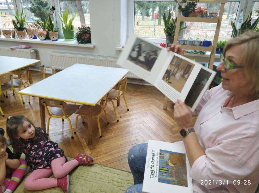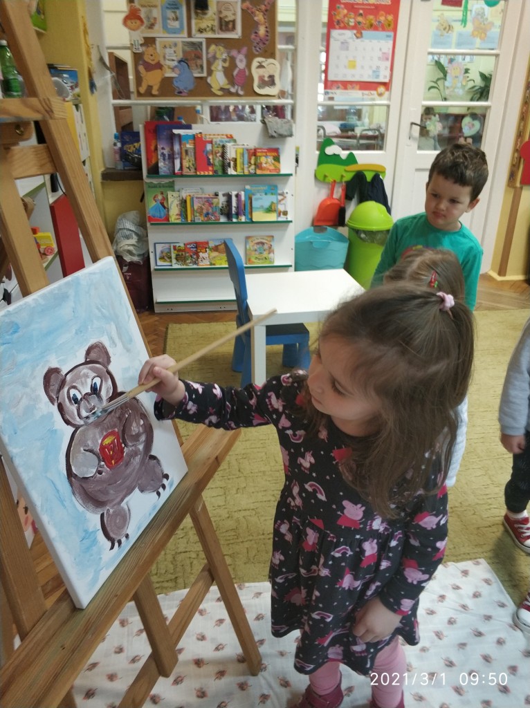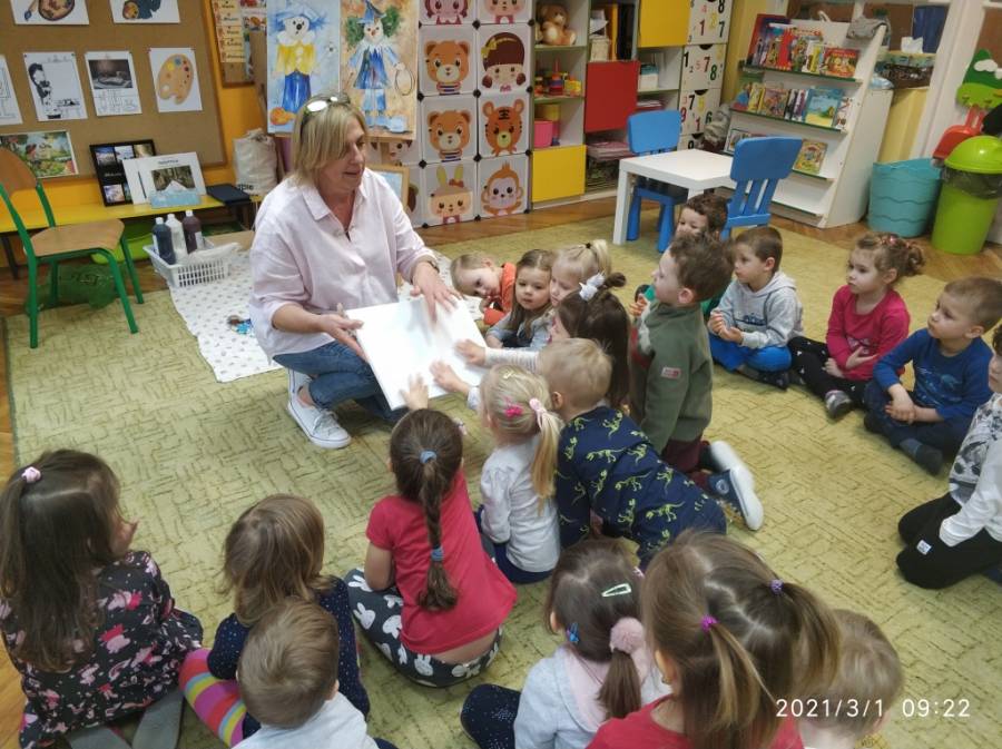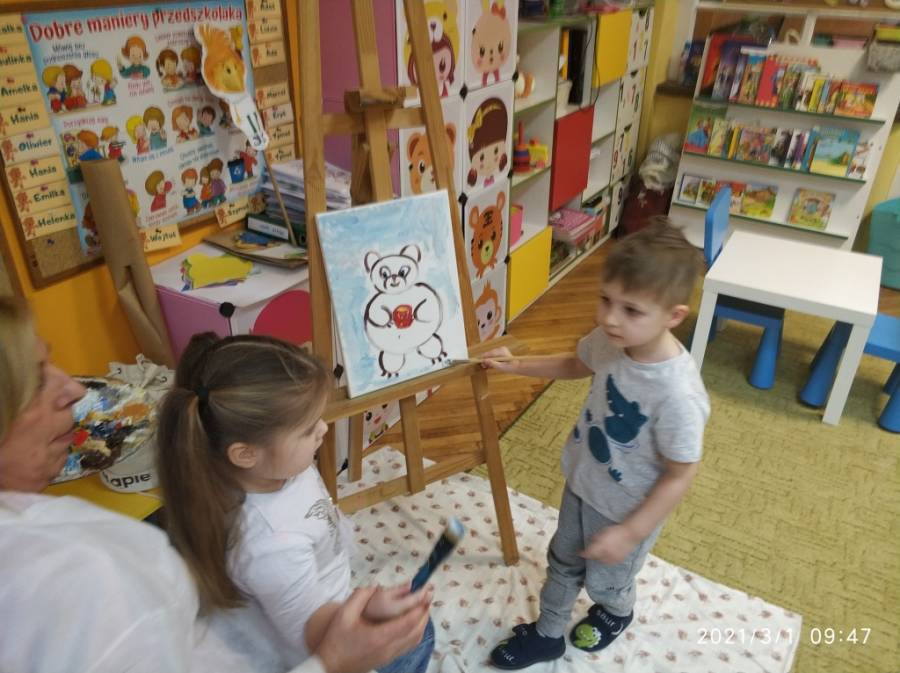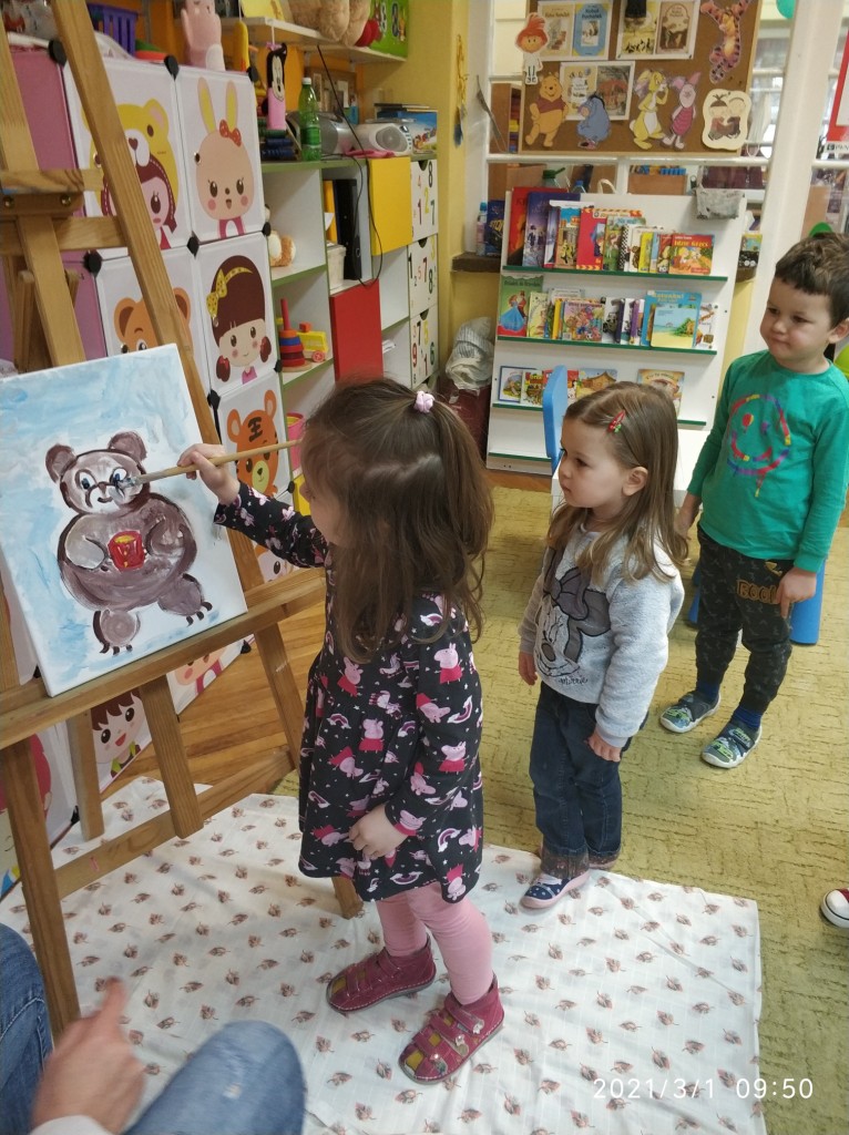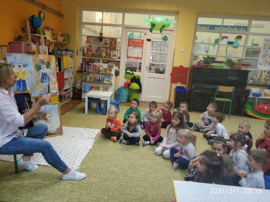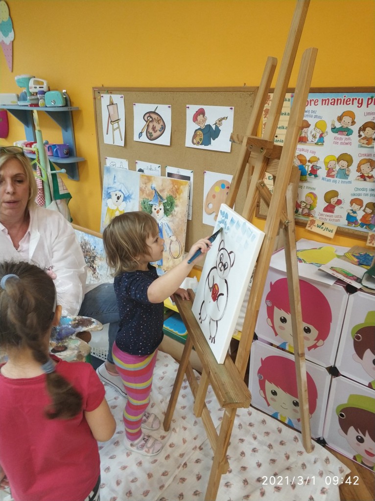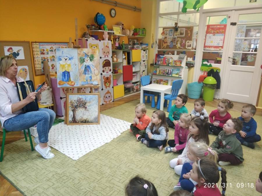 Rozmowa z artystą malarzem połączona z prezentacją obrazów, poznawanie warsztatu malarza oraz akcesorii potrzebnych do malowania. Udział dzieci w tworzeniu wspólnego obrazu.
