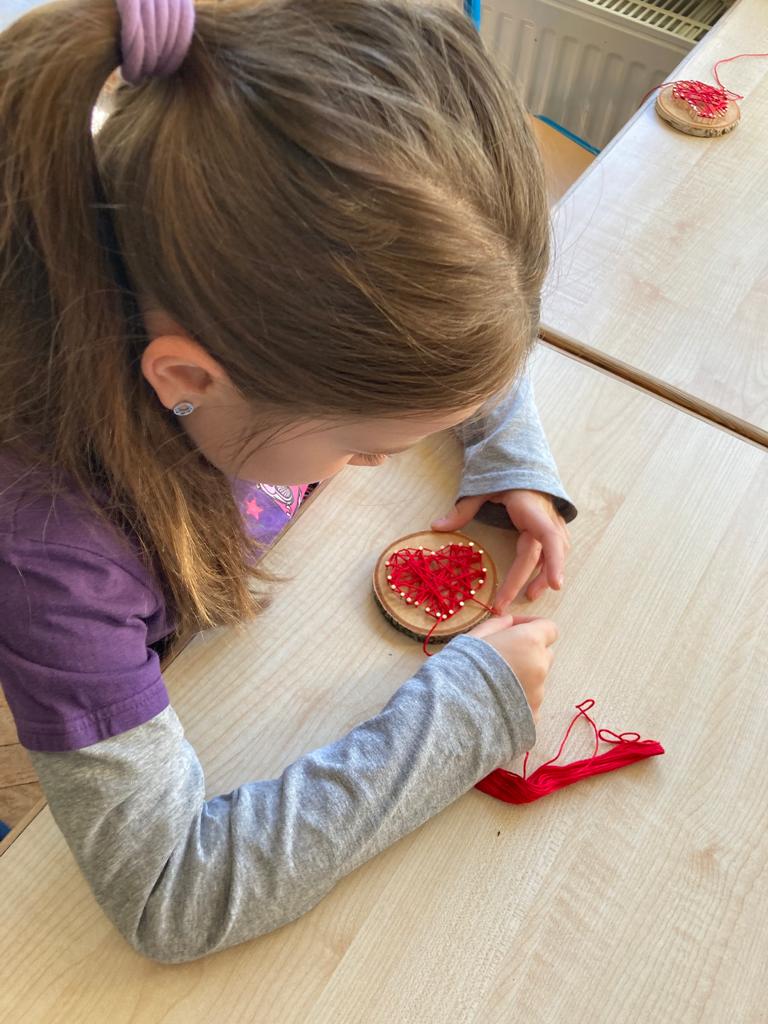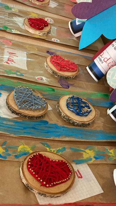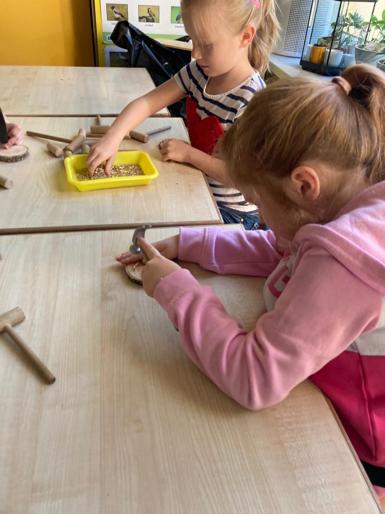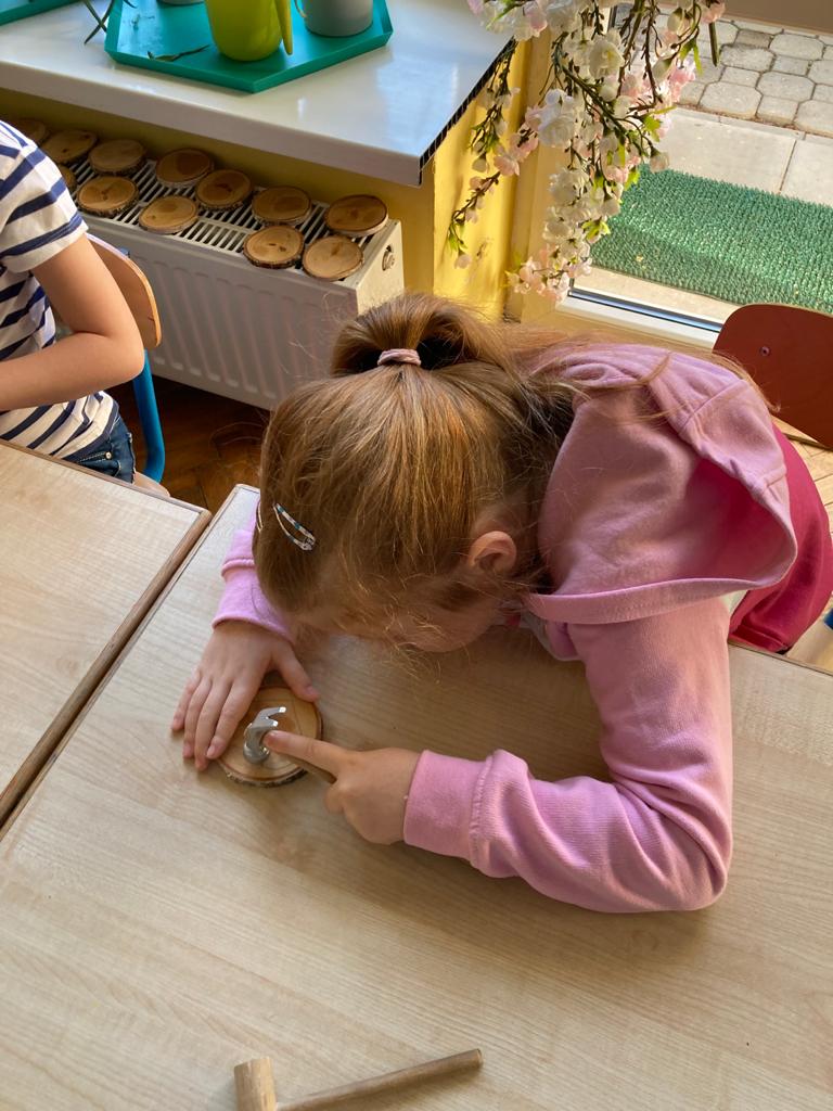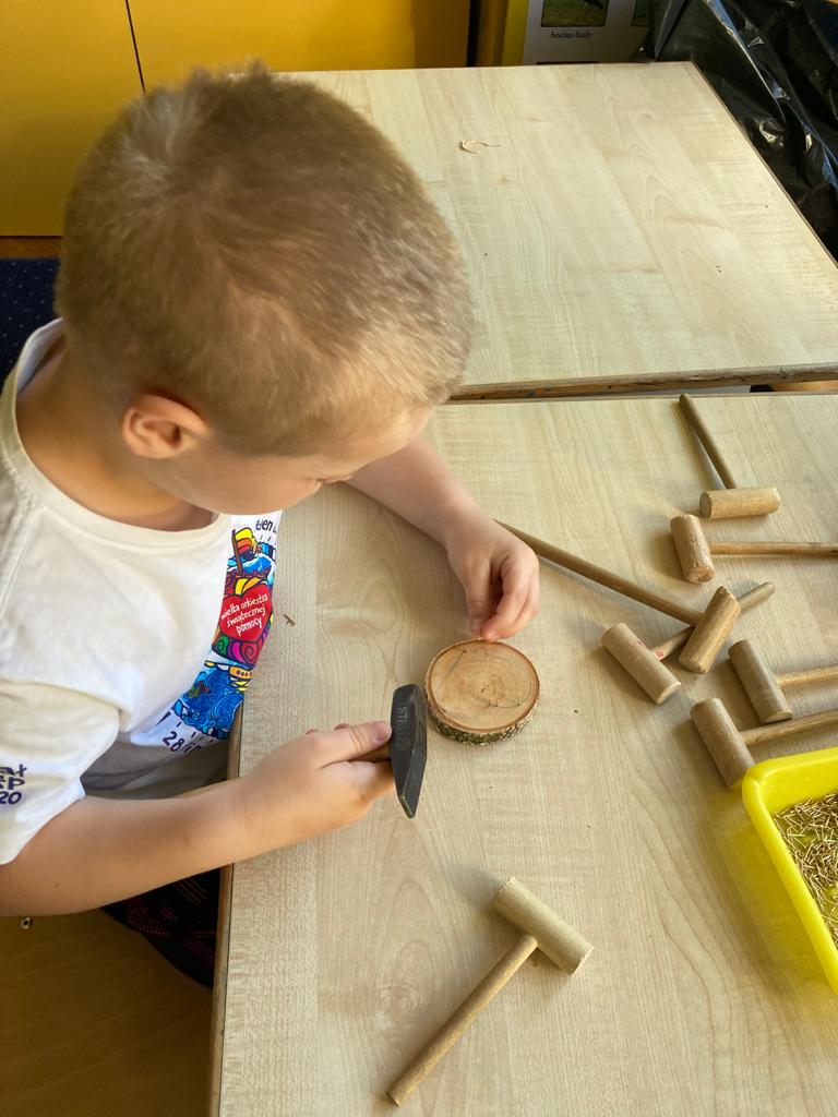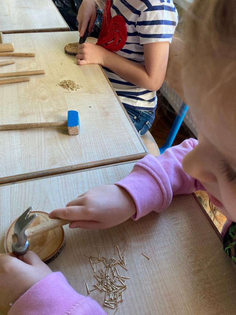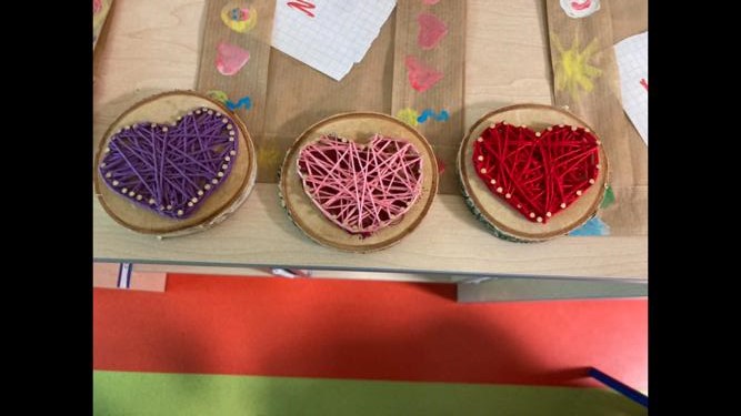 Z Okazji Dnia Mamy Dzieci z gr. V przygotowały piękne serca - samodzielnie wykonane z użyciem młotka i gwoździków ( z zachowaniem ostrożności i pod czujnym okiem pań)