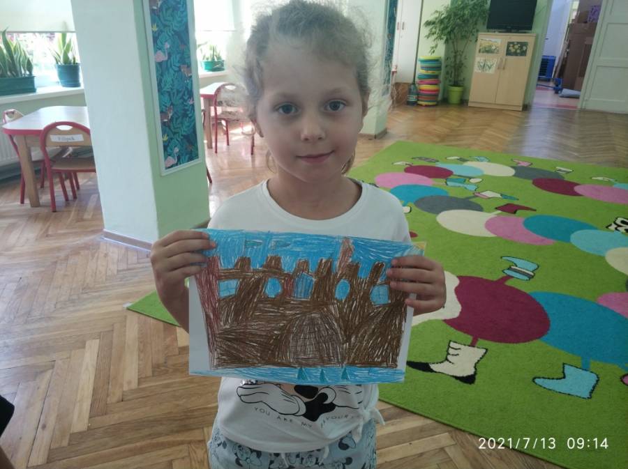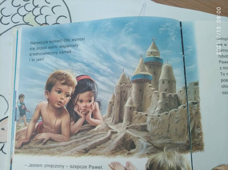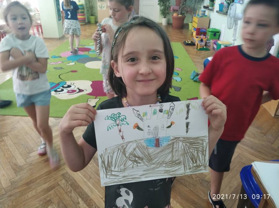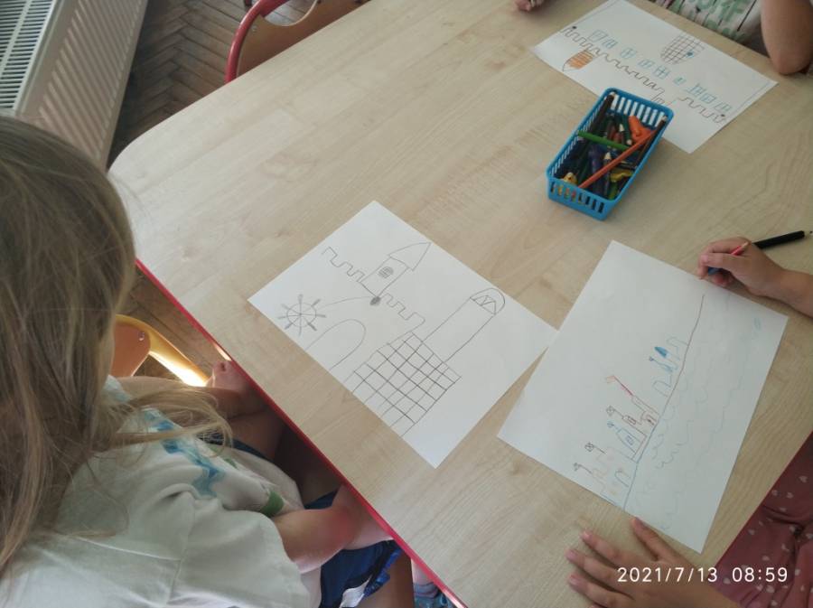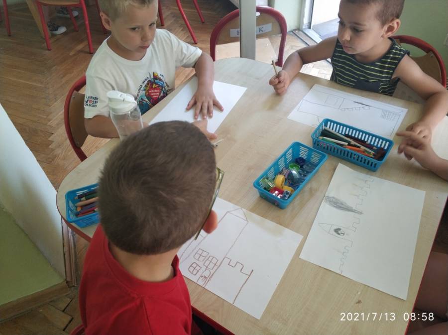 Dzieci wysłuchały opowiadanie pt. "Paweł i Ania nad morzem", które było inspiracją prac plastycznych "Szkice zamków", a następnie tworzenie zamków w piaskownicy.