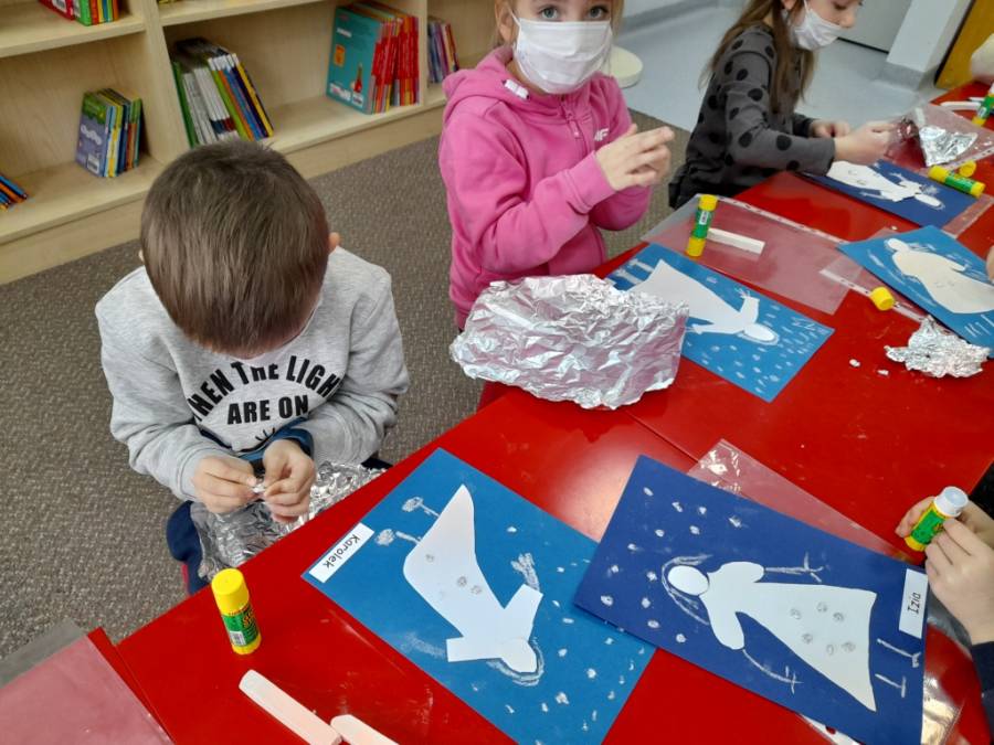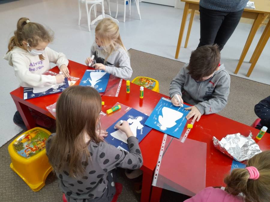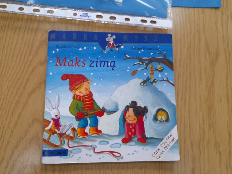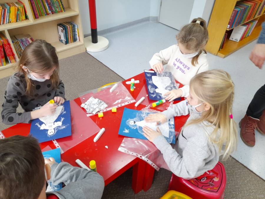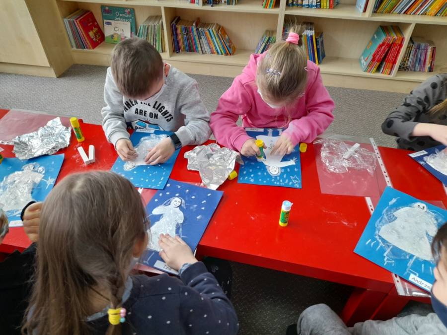 Kolejny dzień ferii urozmaicono zajęciami w bibliotece. Dzieci słuchały opowiadania pt. "Maks zimą" z serii Mądra Mysz Christiana Tielmanna. Chętnie odpowiadały na pytania dotyczące opowiadania jak na tematy związane z zimą, poparte ilustracjami. Zajęcia czytelnicze połączono z twórczością plastyczną. Temat pracy to: "Zimowa Panna"