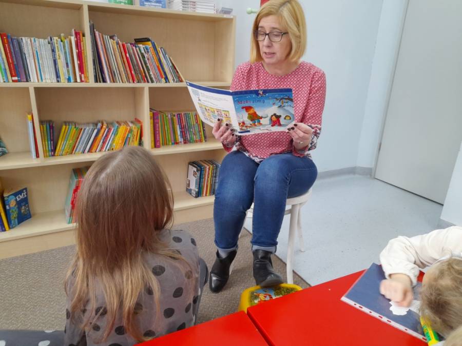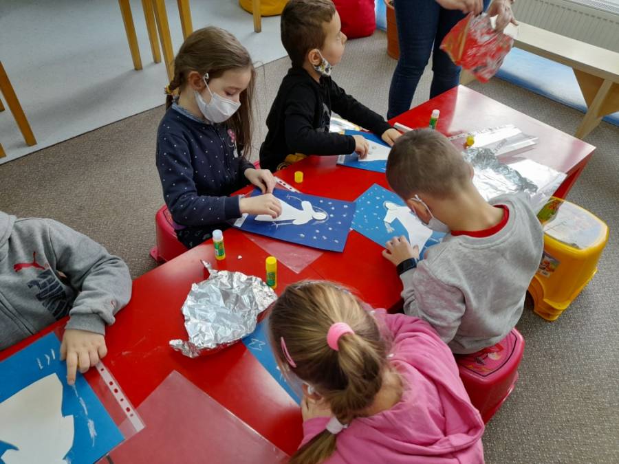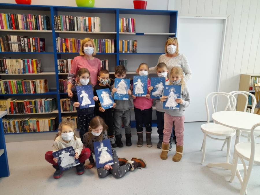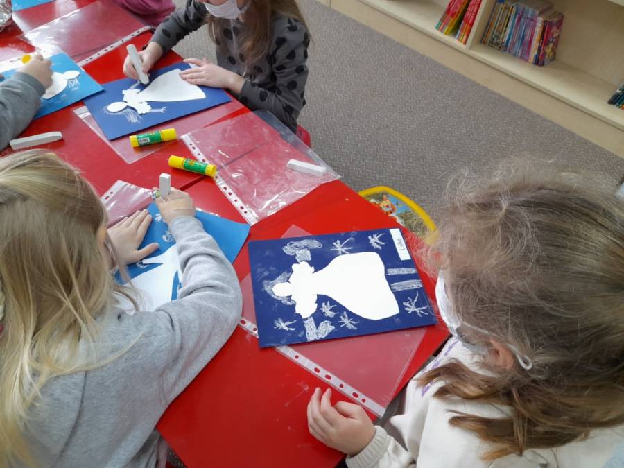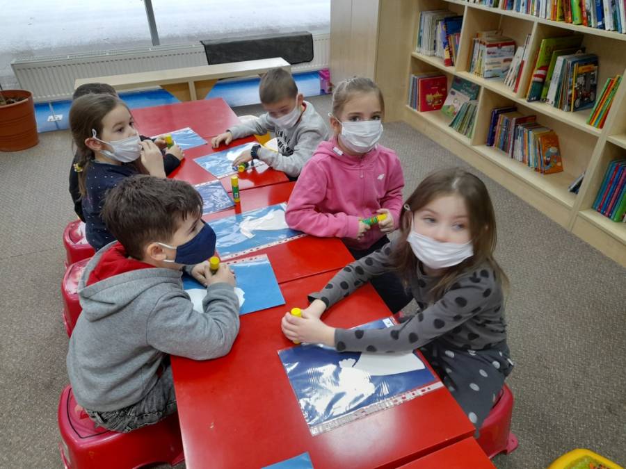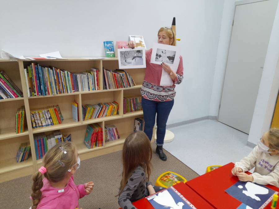 Kolejny dzień ferii urozmaicono zajęciami w bibliotece. Dzieci słuchały opowiadania pt. "Maks zimą" z serii Mądra Mysz Christiana Tielmanna. Chętnie odpowiadały na pytania dotyczące opowiadania jak na tematy związane z zimą, poparte ilustracjami. Zajęcia czytelnicze połączono z twórczością plastyczną. Temat pracy to: "Zimowa Panna"