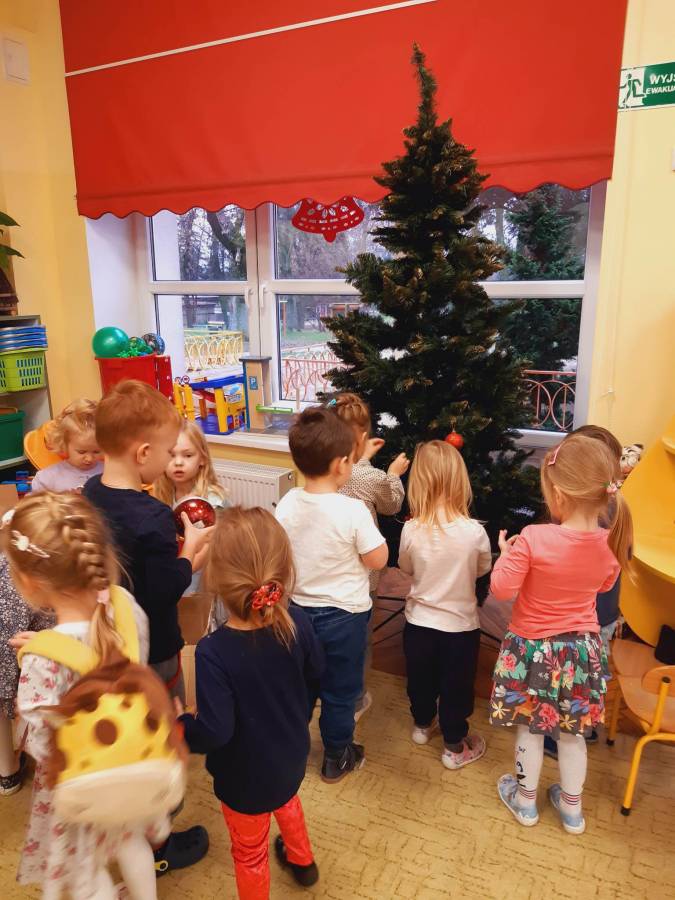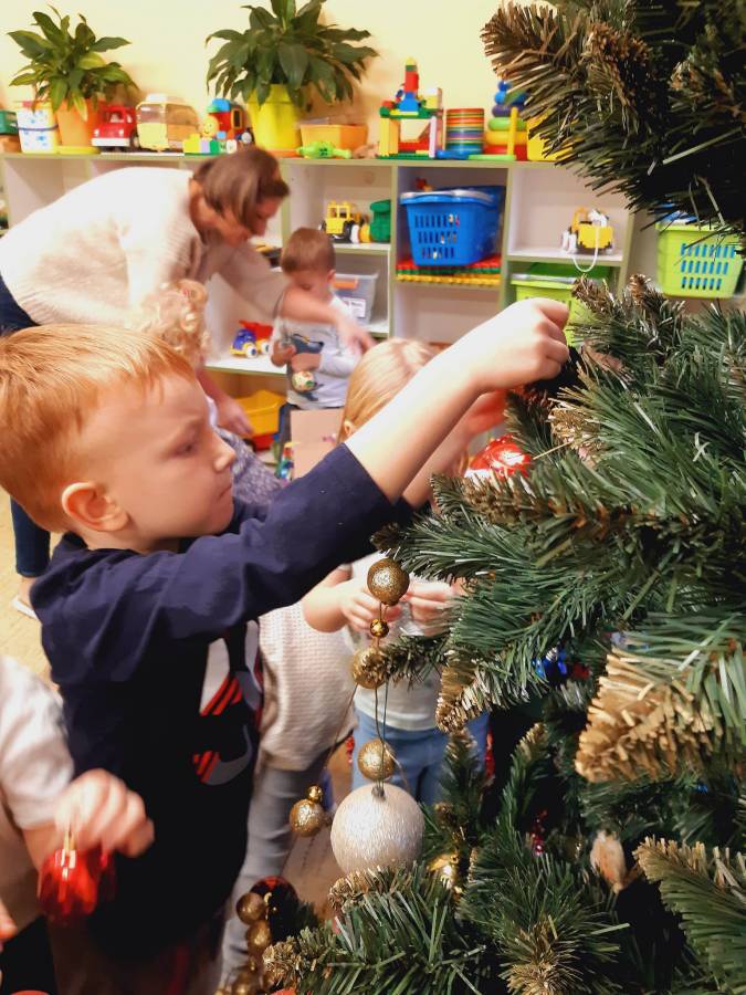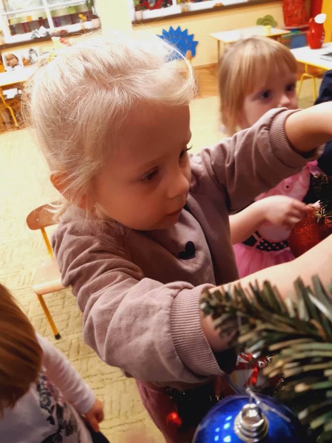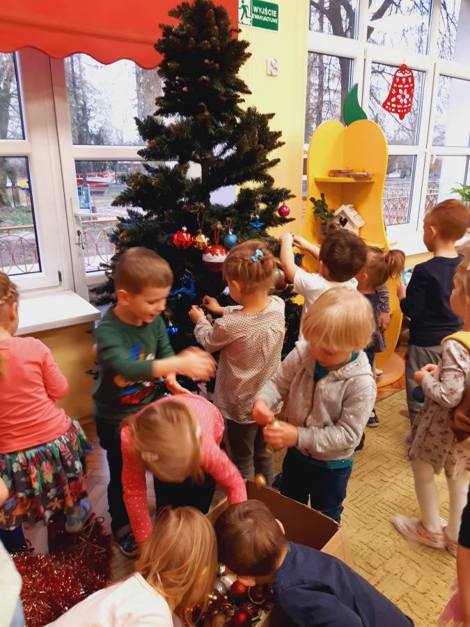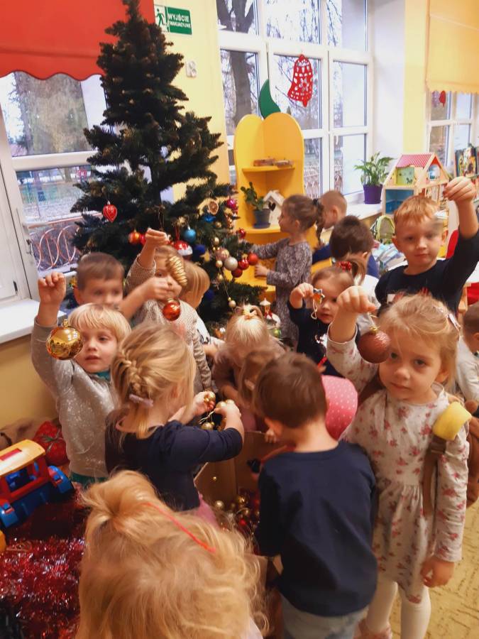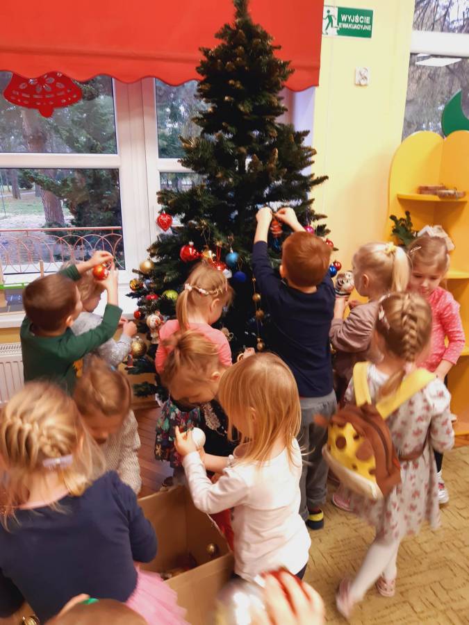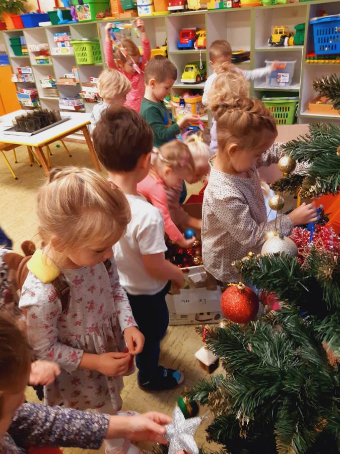 Pracowite Misie ubierały dziś choinkę, podarowaną grupie przez Rodziców Zuzi. Dziękujemy za piękne drzewko.