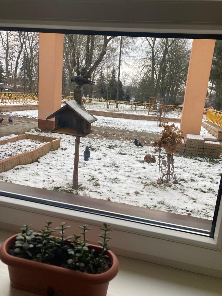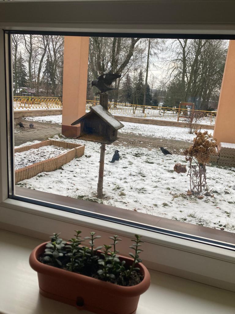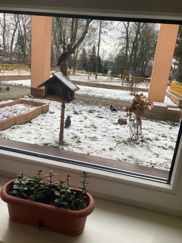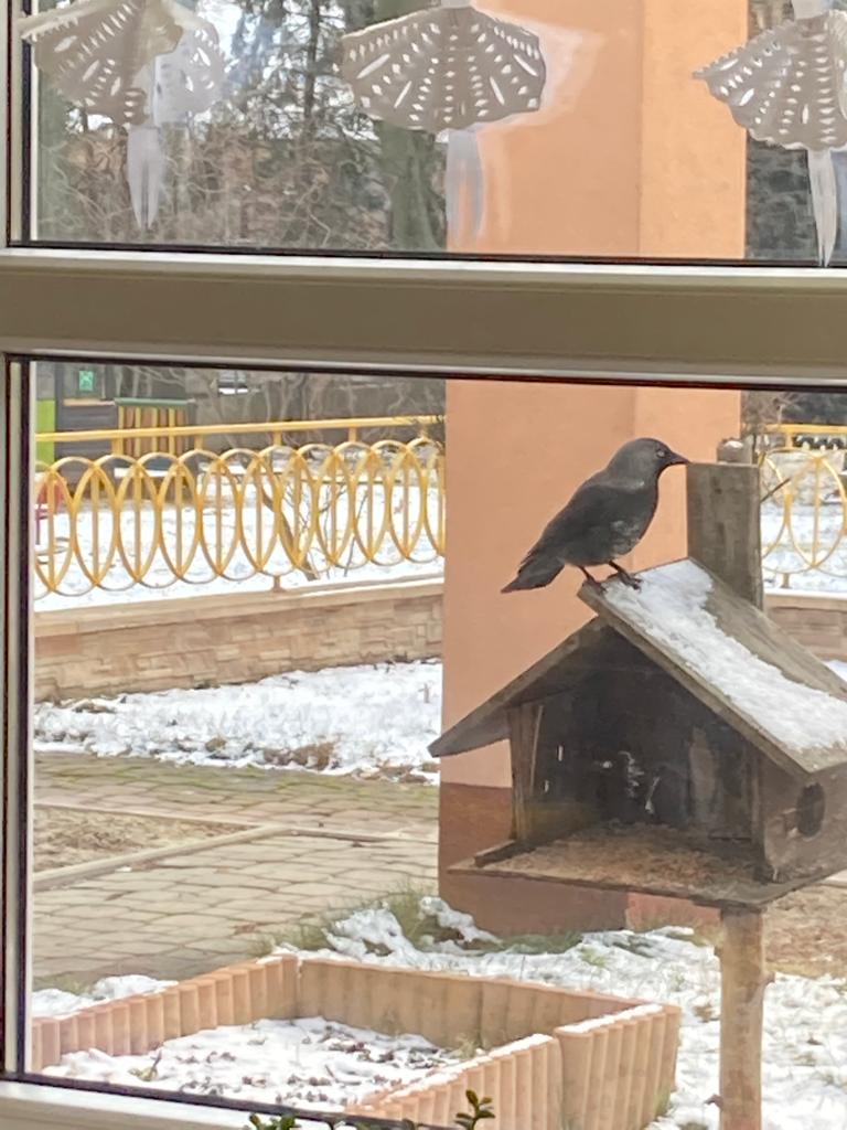 W czasie ferii dokarmiamy ptaki. Przyleciały do nas, lubimy na nie patrzeć.