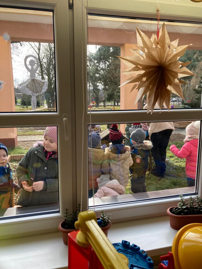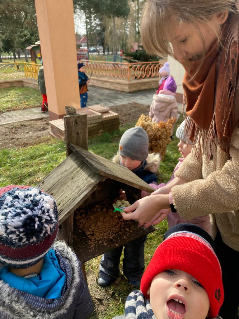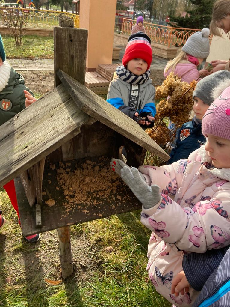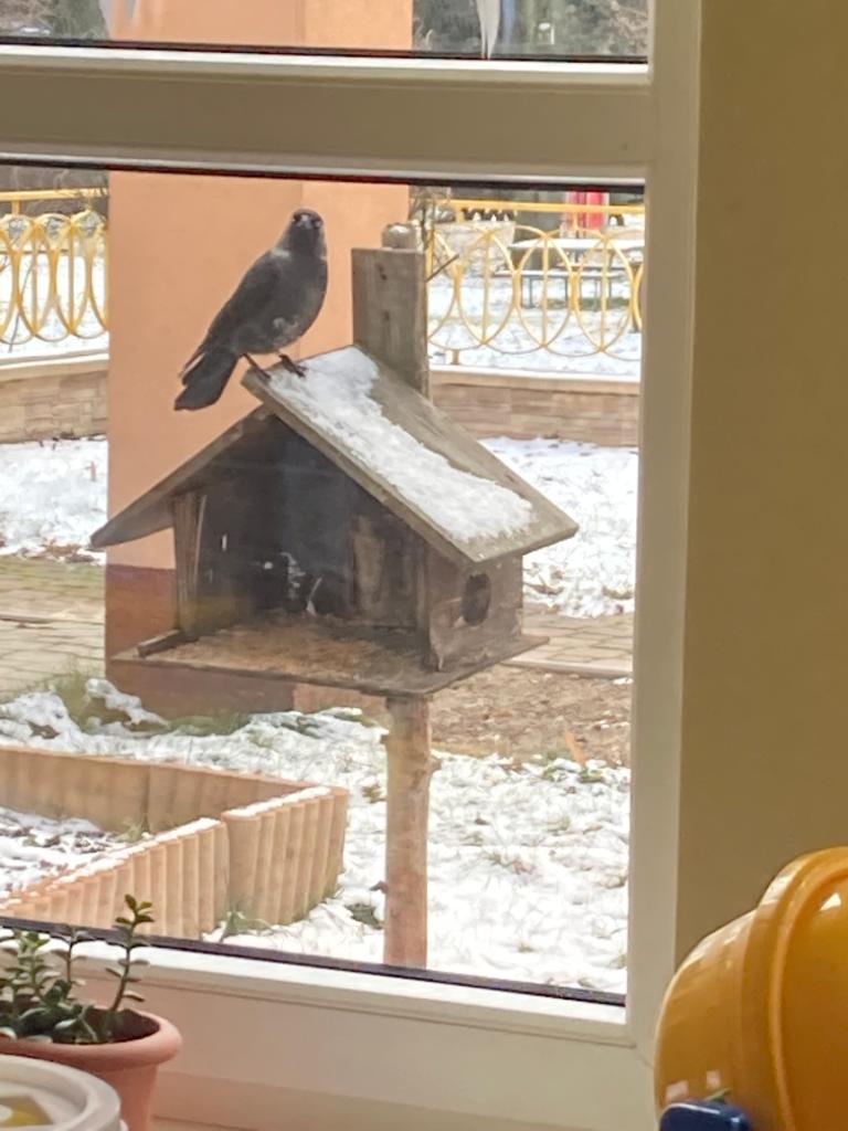 W czasie ferii dokarmiamy ptaki. Przyleciały do nas, lubimy na nie patrzeć.