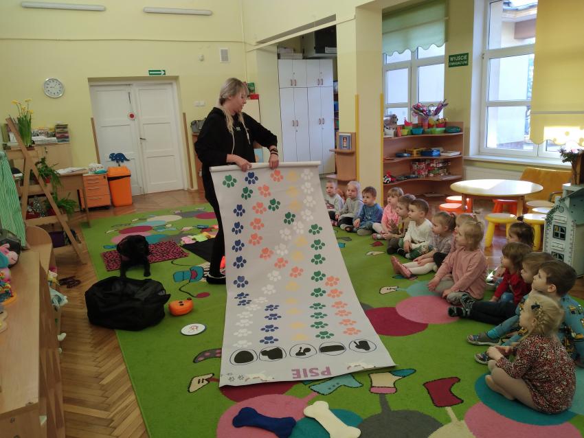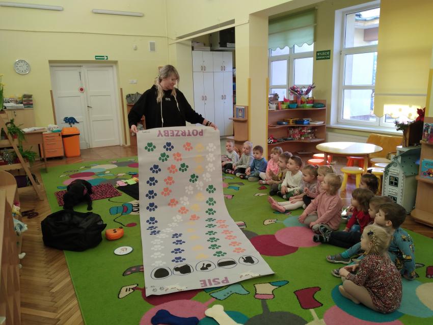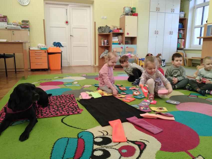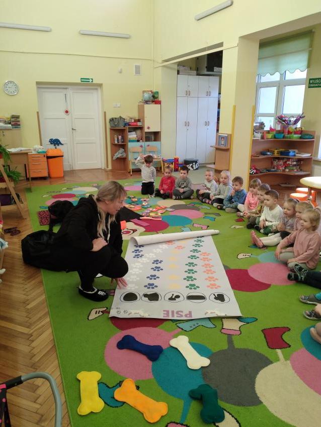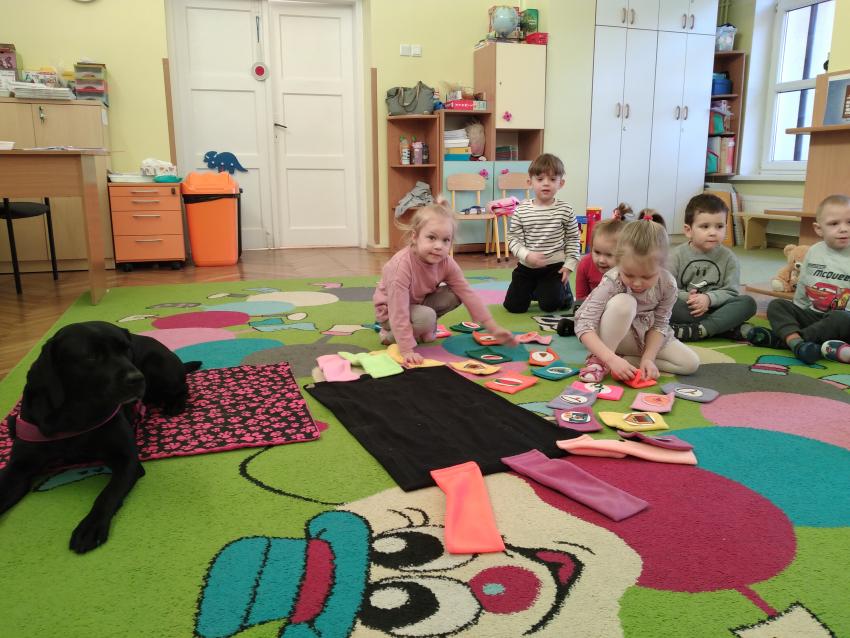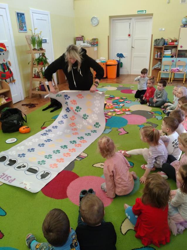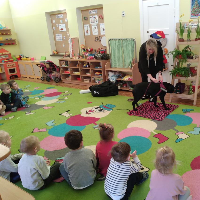 W czwartek 9 lutego gościem grupy "Pracowite Pszczółki " byla mama Bianki Pani Kamila wraz ze swoim wyjątkowym psem. Pani Kamila jest trenerem/ behawiorystą. Pokazala dzieciom jak nalezy postępować w relacji z psem, aby kontakt byl przyjemny z obu stron. Dzieci z duzym zainteresowaniem i zachwytem obserwowaly co potrafi pies. Miały tez okazję wydać komendę poczekac aż pies ją wykona i nagrodzic zwierzaka przysmakiem.