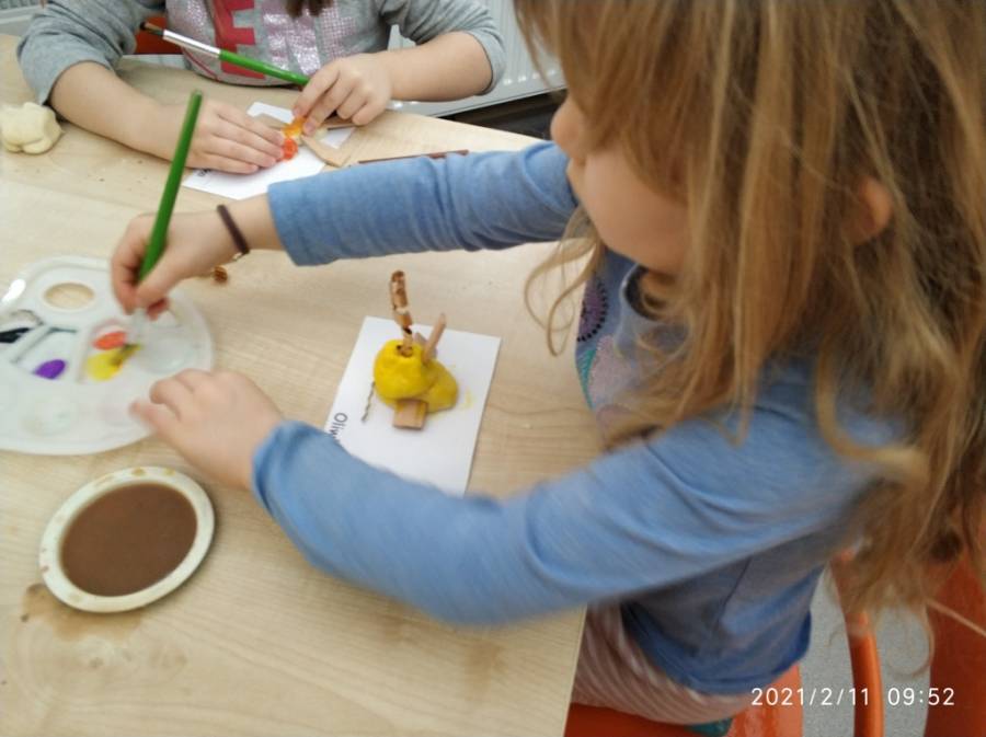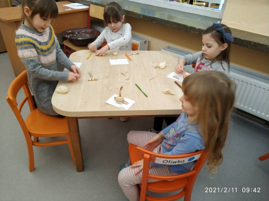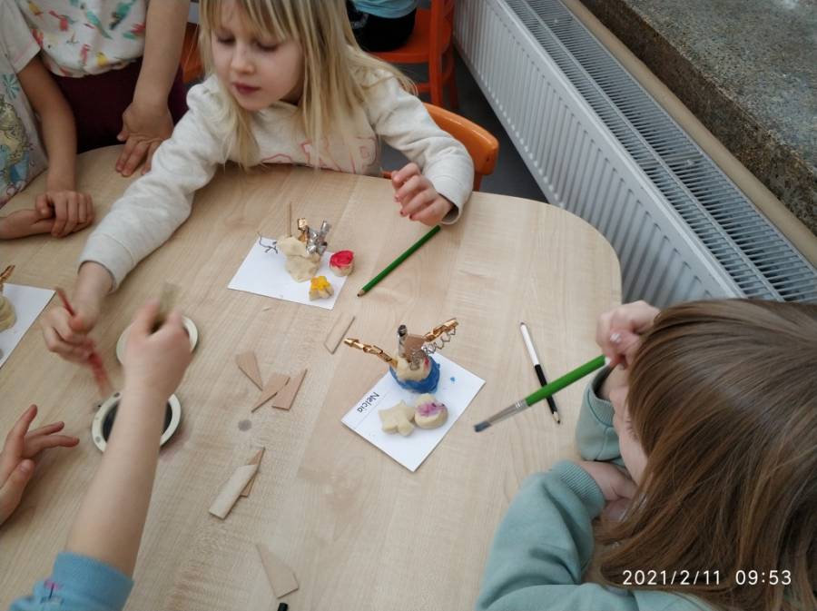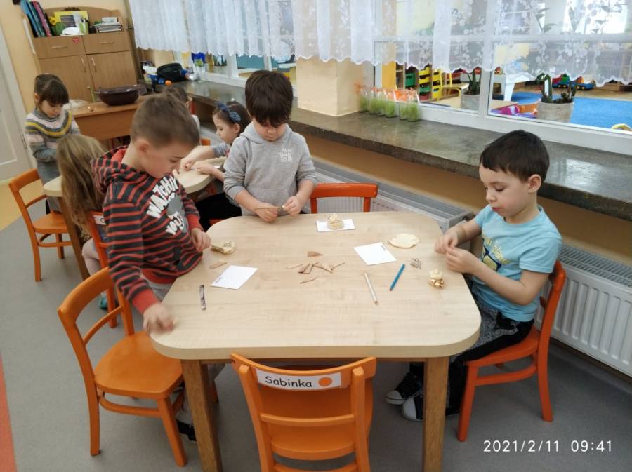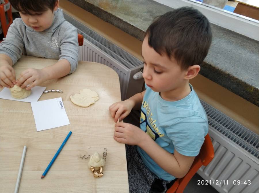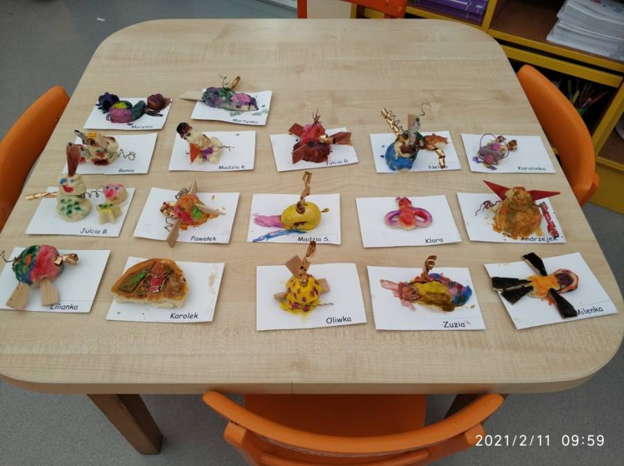 Oglądanie filmu "Czym jest rzeźba?" . Rozmowy na temat sposobu rzeźbienia oraz materiałów, z których można je wykonać. Wspólne tworzenie rzeźby z krzeseł jako nowoczesna instalacja. Zapoznanie z twórczością Wilhelma Sasnala - tarnowskiego artysty. Oglądanie Jego rzeźby wykonanej z betonowych kręgów, a zainstalowanej w pobliżu przedszkola. Tworzenie rzeźb z masy solnej z wykorzystaniem drucików, drewnianych klinów oraz folii aluminiowej. Malowanie ich akrylami.