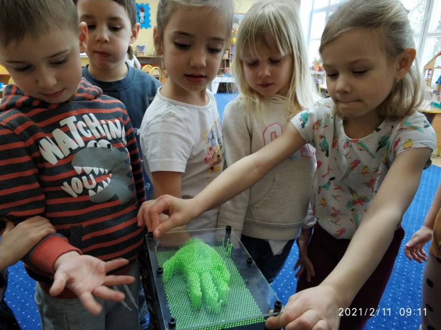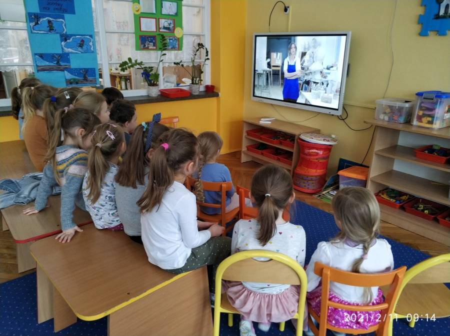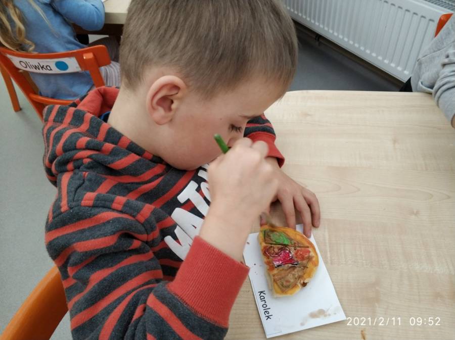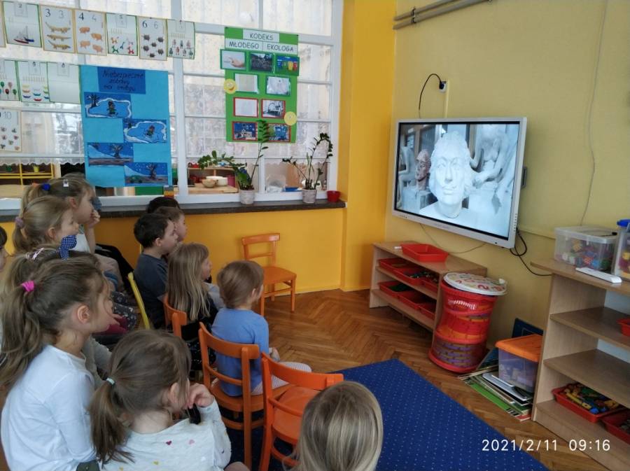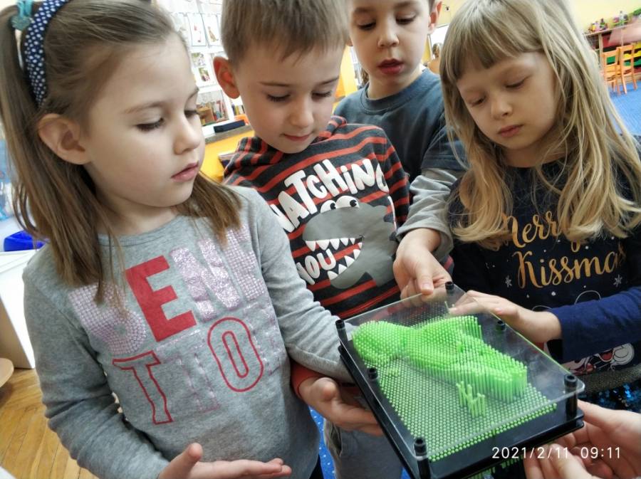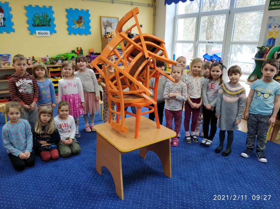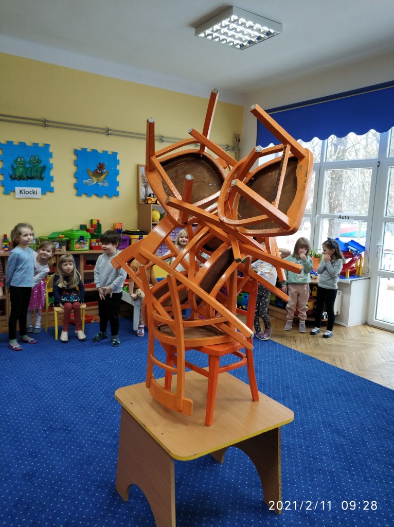 Oglądanie filmu "Czym jest rzeźba?" . Rozmowy na temat sposobu rzeźbienia oraz materiałów, z których można je wykonać. Wspólne tworzenie rzeźby z krzeseł jako nowoczesna instalacja. Zapoznanie z twórczością Wilhelma Sasnala - tarnowskiego artysty. Oglądanie Jego rzeźby wykonanej z betonowych kręgów, a zainstalowanej w pobliżu przedszkola. Tworzenie rzeźb z masy solnej z wykorzystaniem drucików, drewnianych klinów oraz folii aluminiowej. Malowanie ich akrylami.
