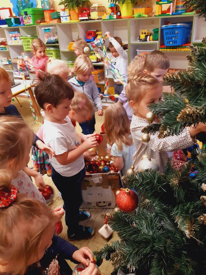 Pracowite Misie ubierały dziś choinkę, podarowaną grupie przez Rodziców Zuzi. Dziękujemy za piękne drzewko.