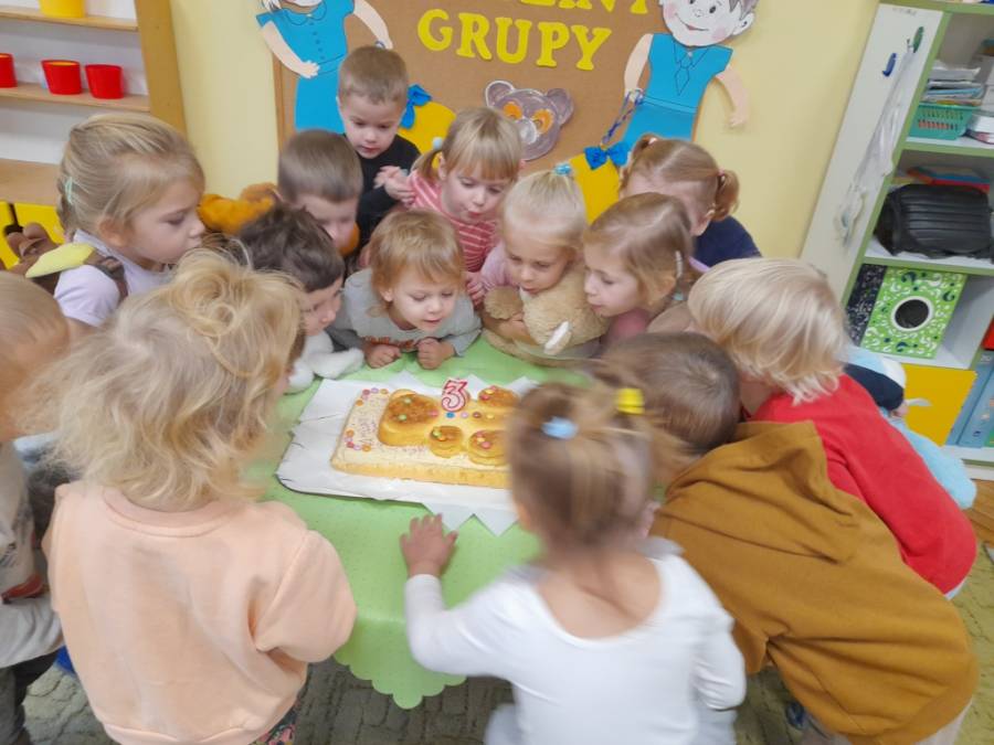 Tak świętowaliśmy nasze grupowe urodziny. Dodatkowo dzieci stworzyły piękne prace Misiów, które ozdabiają naszą szatnię