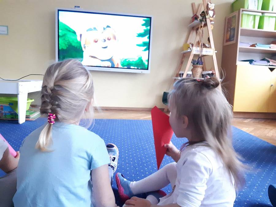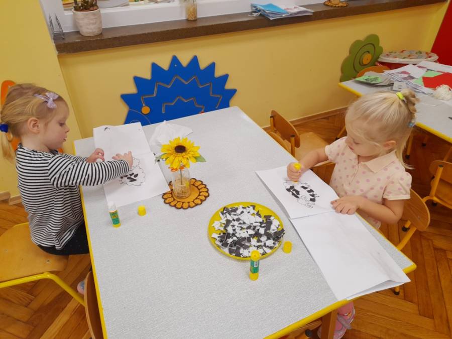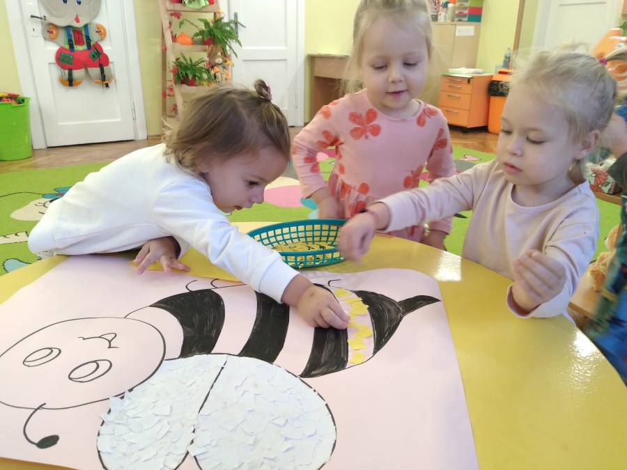 Zaangażowanie dzieci do powstania scenografii na Uroczystość Pasowania, okazało się strzałem w dziesiątkę. Chętnie wyklejały postaci Misia i Pszczółki. Powstały piękne obrazy.