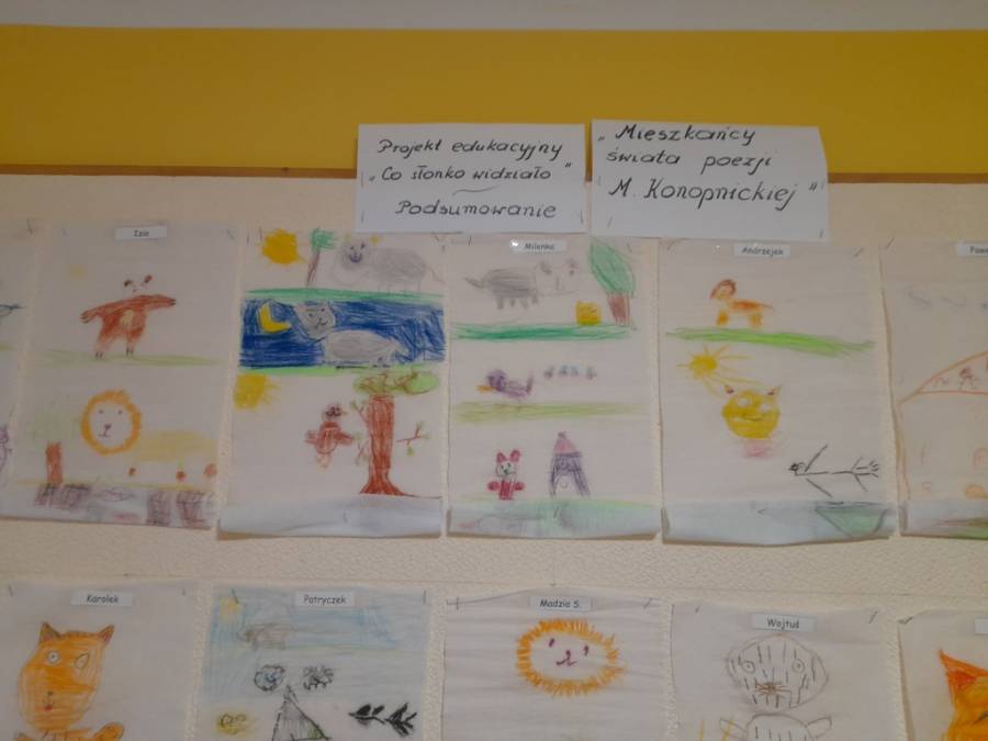 "Mieszkańcy świata poezji Marii Konopnickiej" to podsumowanie w formie plastycznej w/w projektu. Dzieci stworzyły prace inspirowane tekstami autorki.Na uwagę zasługuje doskonała znajomość treści wierszy, bajek, opowiadań.Zajęcia cieszyły się dużym powodzeniem i chętnie w nich uczestniczyły.Projekt korelował z naszym trwającym cztery lata programem innowacyjnym "W Baśniowym Królestwie". Na przestrzeni lat prowadzenia programu czytelniczego, można zauważyć u naszych podopiecznych zainteresowanie literaturą i sztuką, wzbogacenie słownictwa oraz poszerzenie wiedzy ogólnej. Realizacja programu miała być przede wszystkim zachętą, by dzieci częściej sięgały po książki. Mamy nadzieję, że teraz książka stanie się ich wiernym przyjacielem.
