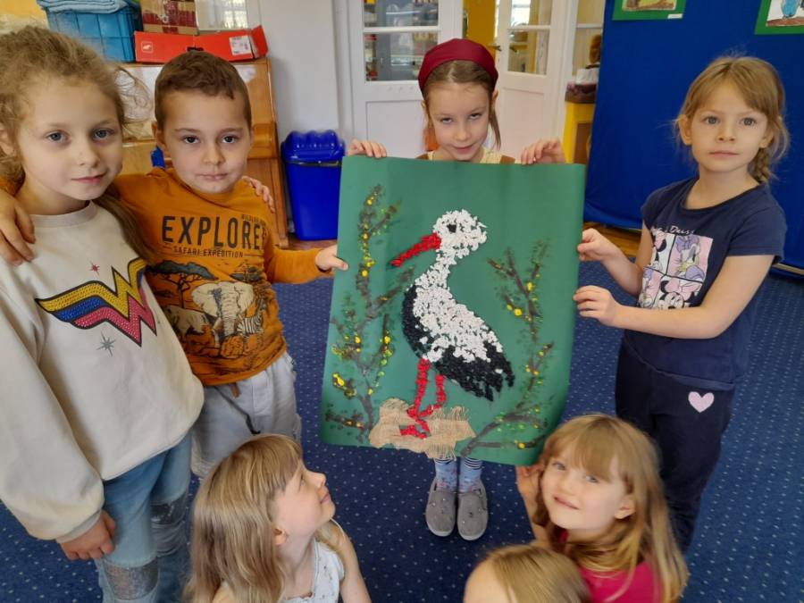 Po wysłuchaniu i analizie wiersza pt. "Bocian" Marii Konopnickiej, chętne dzieci wykonały pracę zatytułowaną "Bocian - symbol polskiej wsi".