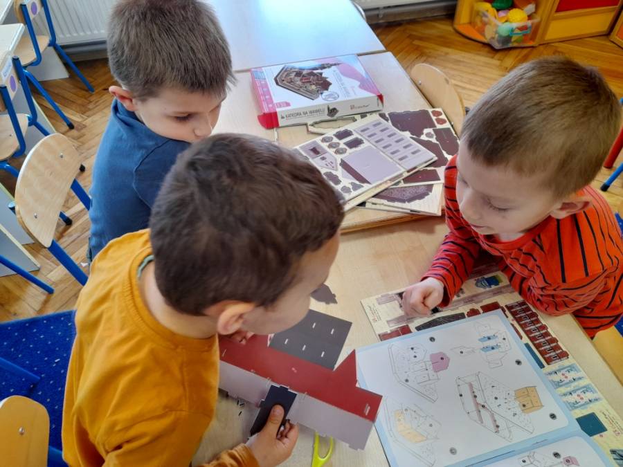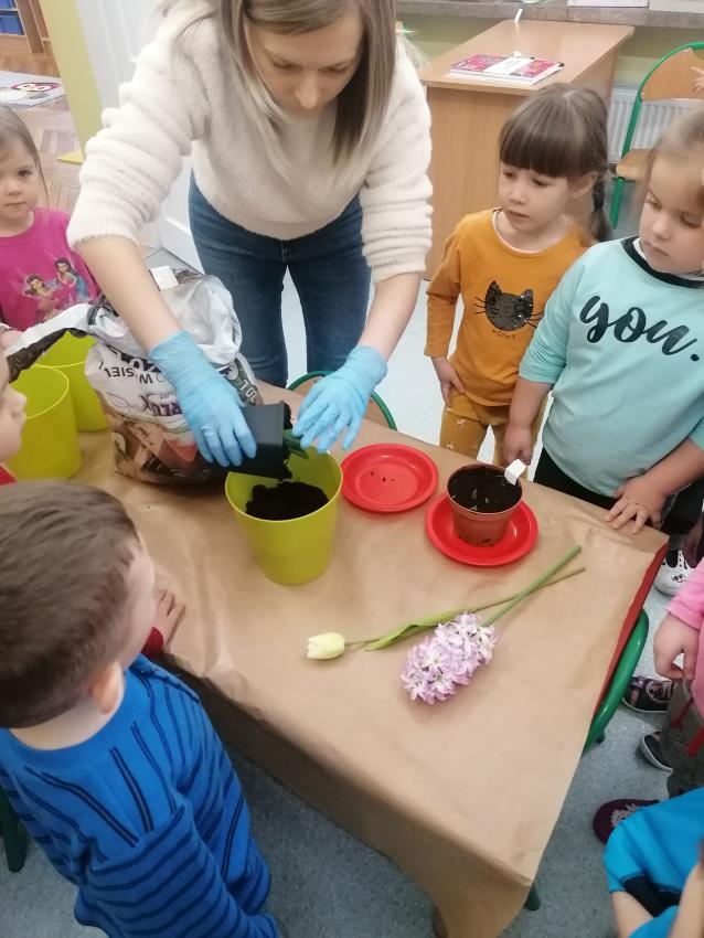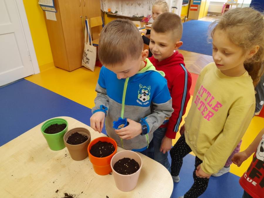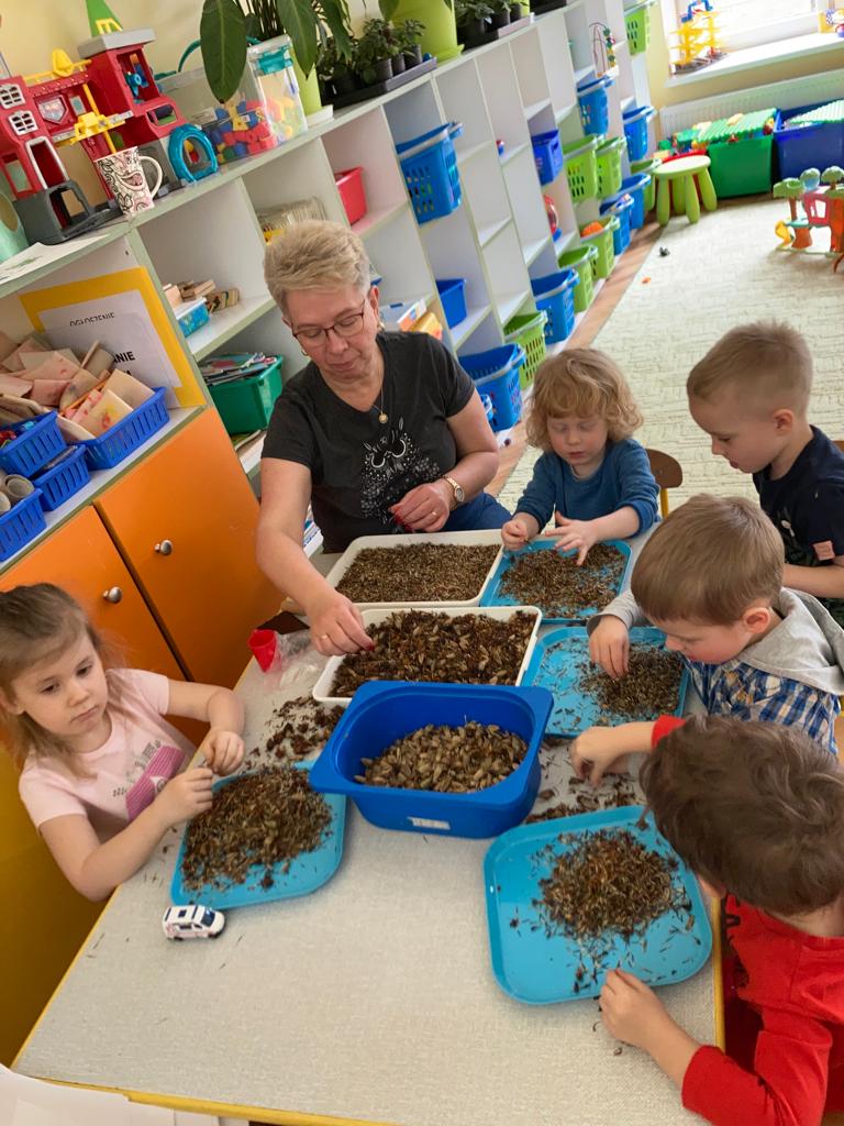 Maluszki jak Kopciuszki przygotowują nasiona kwiatów-aksamitek do wysiewu w ogrodzie przedszkolnym.