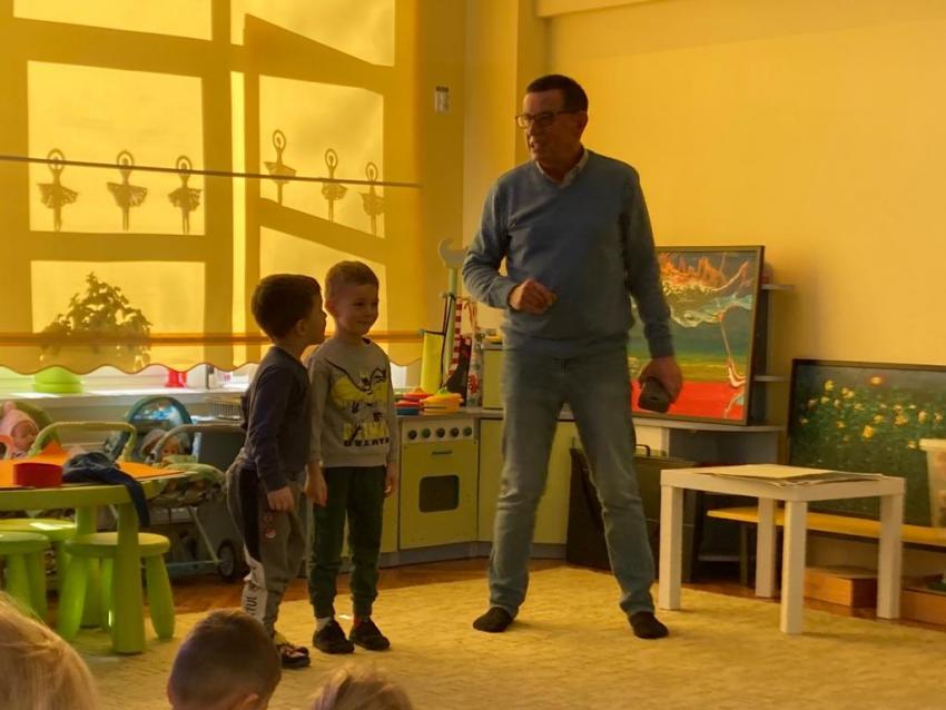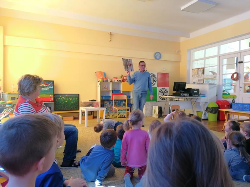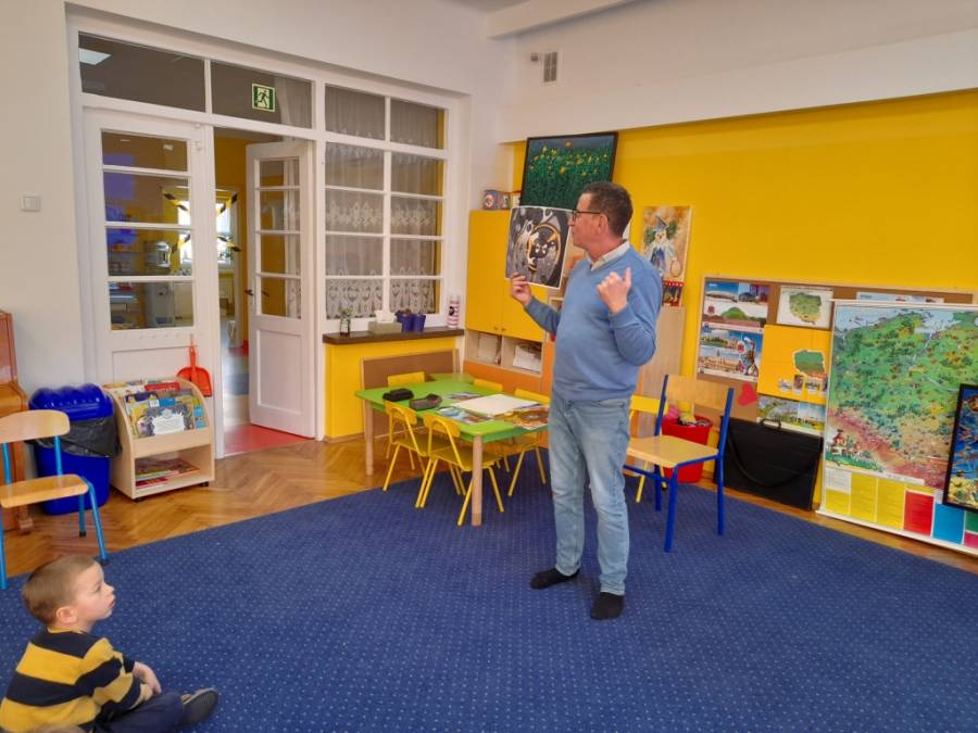Gość, który odwiedził  dzisiaj nasze przedszkole, to autor wspaniałych wierszy i opowiadań dla dzieci Wojciech Ulman. Ciekawie opowiadał o świecie zwierząt, a także wprowadził nas w świat wyobraźni, pokazując swoje abstrakcyjne obrazy. Zachęcał do częstego czytania książek, gdyż dzięki nim poznajemy świat. Dzieci chętnie i aktywnie uczestniczyły w spotkaniu.