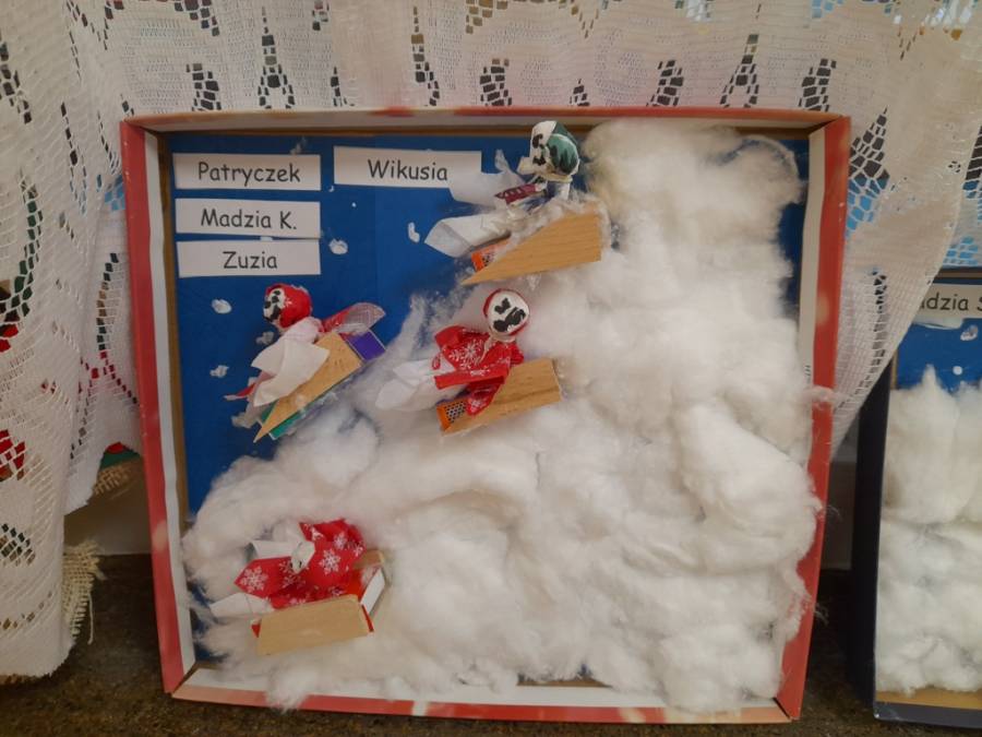 Kolejny dzień ferii urozmaicono zajęciami w bibliotece. Dzieci słuchały opowiadania pt.  "Maks zimą" z serii Mądra Mysz Christiana Tielmanna. Chętnie odpowiadały na pytania dotyczące opowiadania jak na tematy związane z zimą, poparte ilustracjami. Zajęcia czytelnicze połączono z twórczością plastyczną. Temat pracy to: "Zimowa Panna"