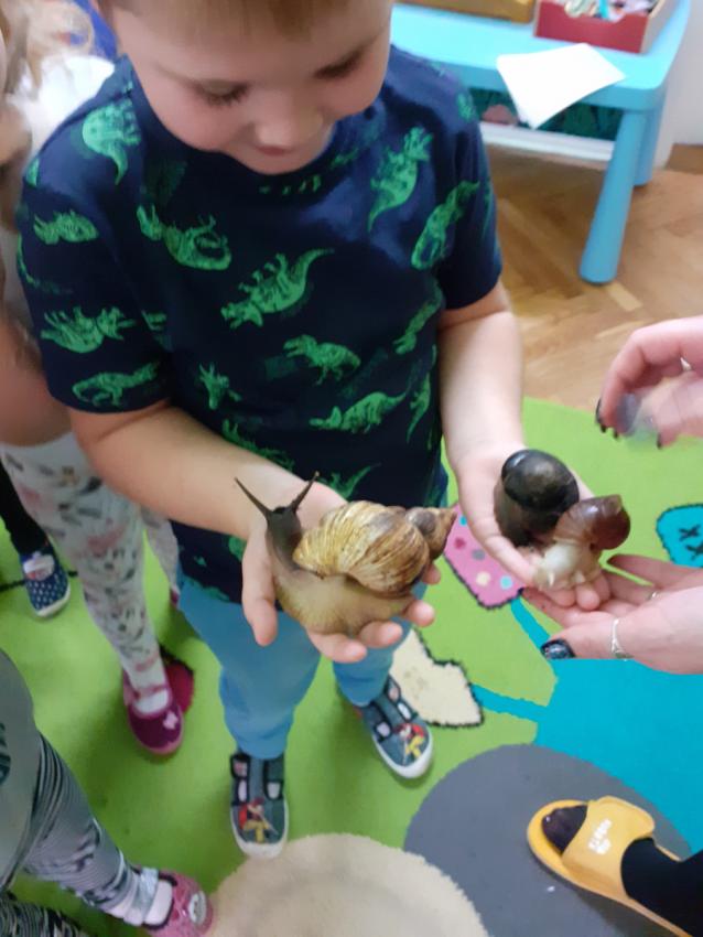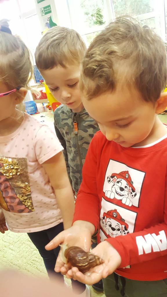 Zajęcie przeprowadziła studentka Pani Kasia w ramach praktyki. Przedstawiła wspaniałe okazy ślimaków pochodzących ze wschodniej Afryki oraz Ameryki Środkowej. Dzieci miały okazję wysłuchać informacji dotyczących życia i zwyczajów, a także dotykać ich. Lekcja bardzo interesująca nie tylko dla dzieci, a także dla dorosłych. Dziękujemy!!!